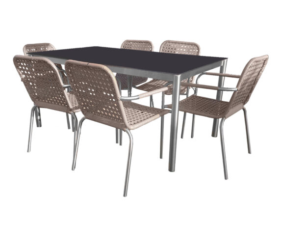 Set Pranzo 90×160 + 6 Poltrone Whicker in Acciaio e Vetro