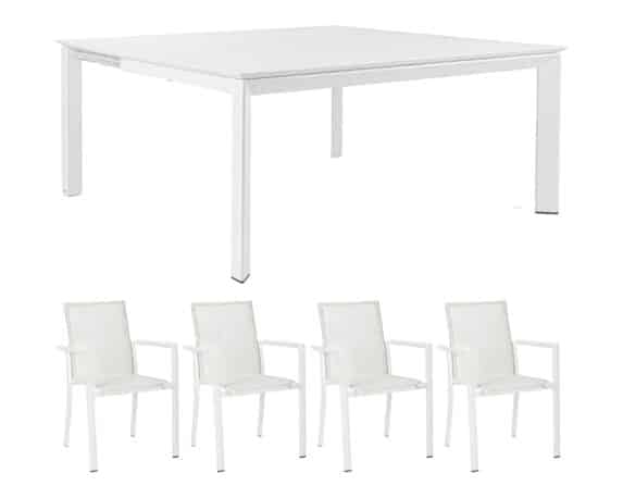 Set Pranzo Tavolo Cross Fisso + 4 Sedie con Braccioli Bianco in Alluminio, Ceramica e Textilene