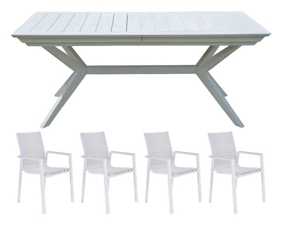 Set Pranzo Tavolo Allungabile 180/240x100cm + 4 Poltrone Bianco in Alluminio e Textilene