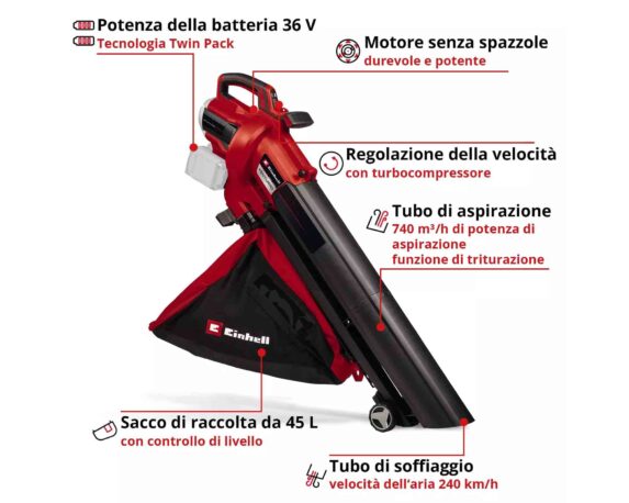 Soffiatore e Aspiratore a Batteria 36 V Potenza di Aspirazione 740m³ 36/240 – Einhel