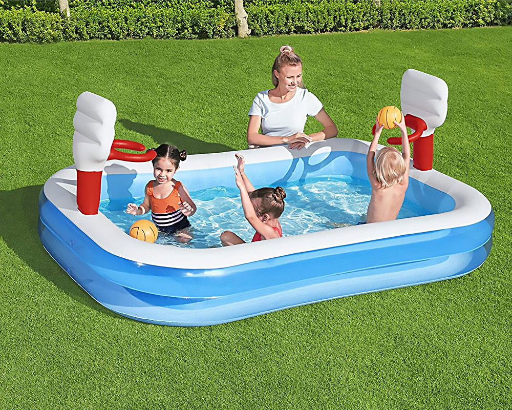 - Completo di due canestri da basket gonfiabili e tabelloni attaccati alle due estremità della piscina.