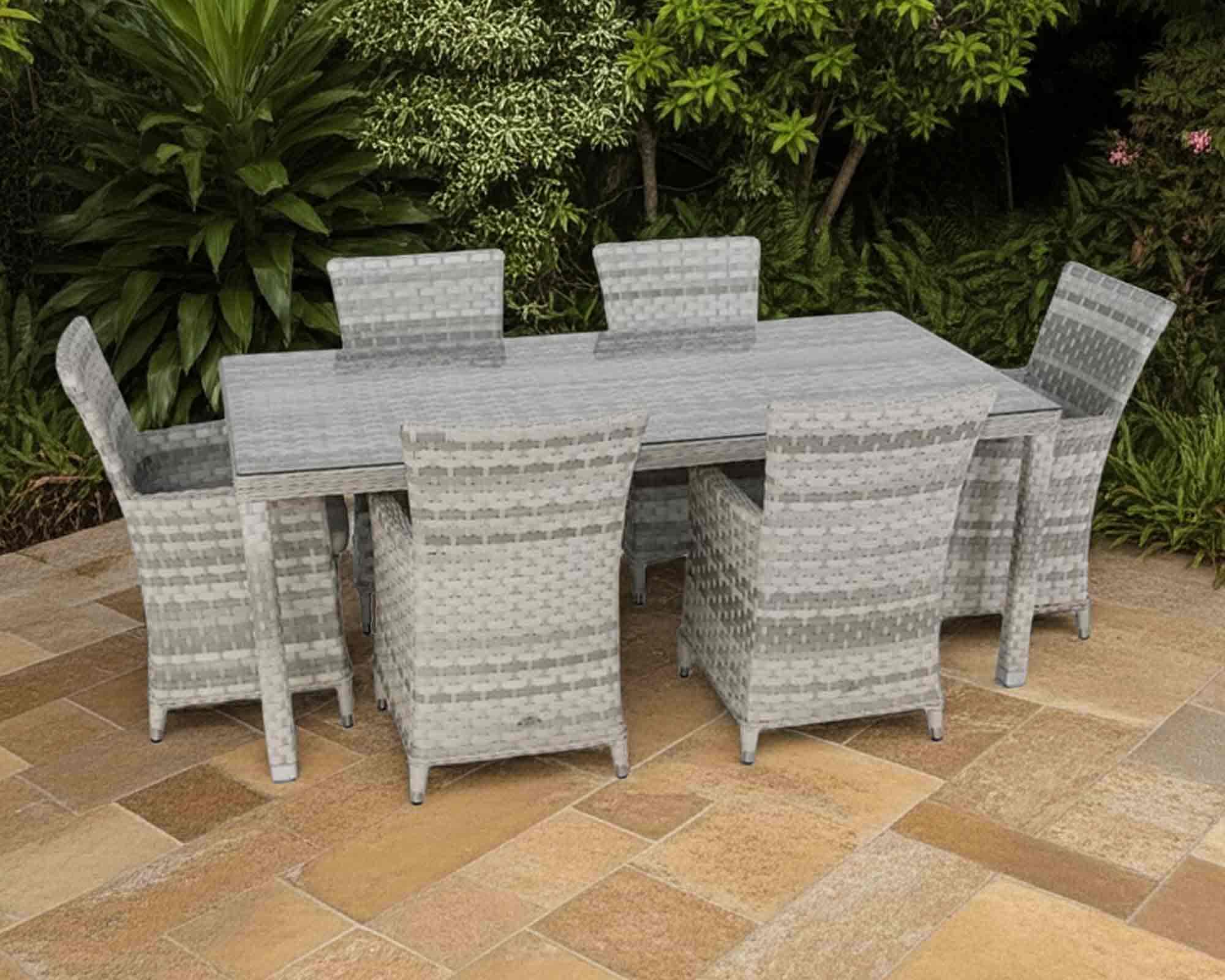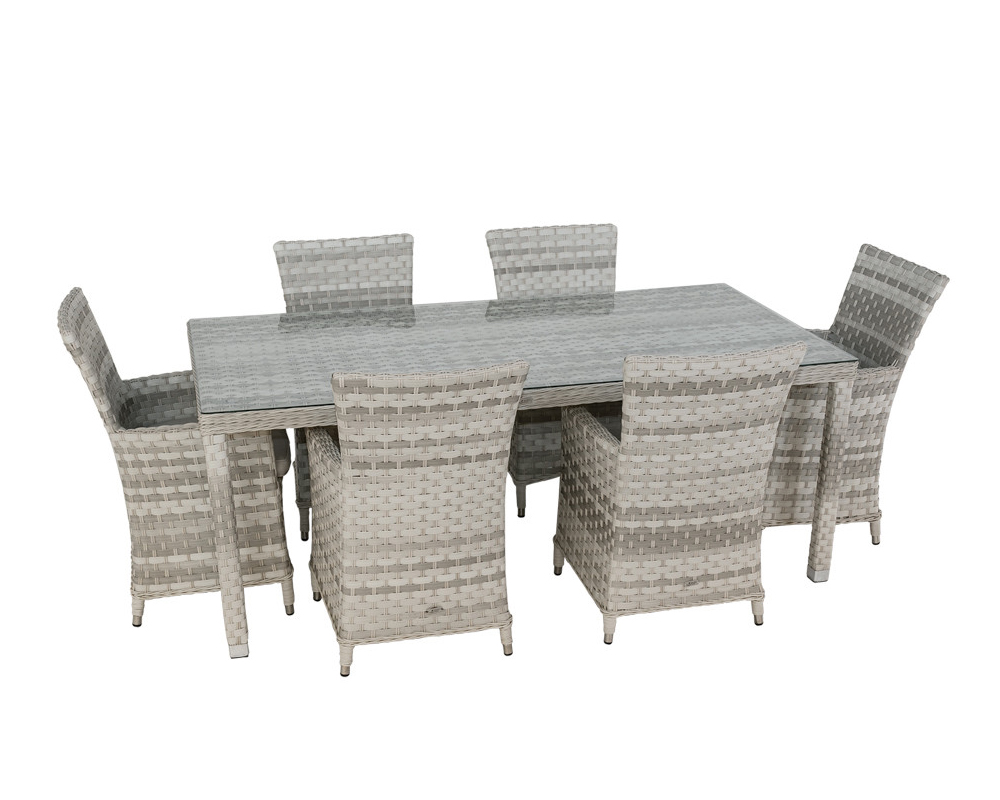 Il set 7 Pz Pranzo Portland fisso è la soluzione ideale per chi desidera arredare il proprio spazio all’aperto con eleganza e funzionalità. Il tavolo fisso di forma rettangolare, dalle dimensioni generose (220×100 cm), è realizzato con materiali di alta qualità, che ne garantiscono la resistenza e la durata nel tempo. La struttura è in alluminio, leggero ma robusto, mentre la superficie del piano è in vetro temperato di spessore 5 mm, facile da pulire e resistente alle intemperie.