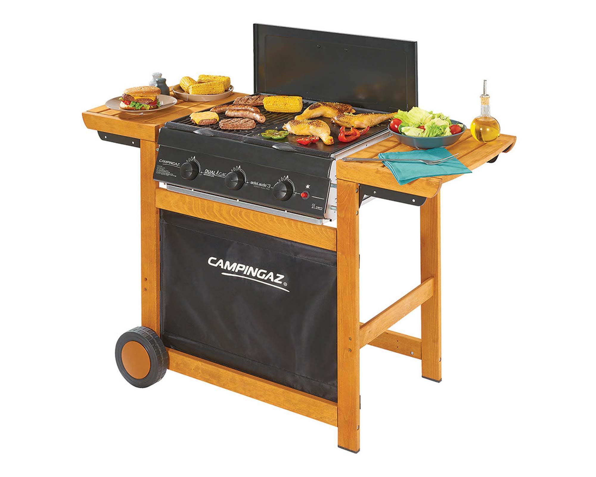 L’Adelaïde® 3 Woody, un evergreen della famiglia Campingaz®, da oggi disponibile con doppia alimentazione Dual Gas (Metano/GPL). Adelaide 3 Woody DualGas è dotato di una doppia superficie di cottura composta da griglia e piastra, per soddisfare tutti i tipi di appetito.