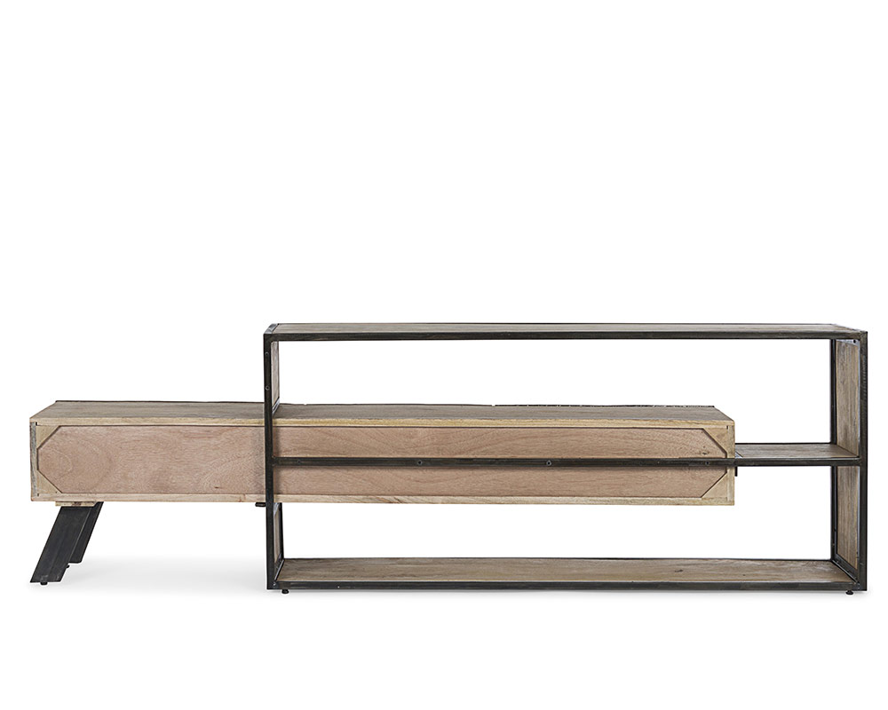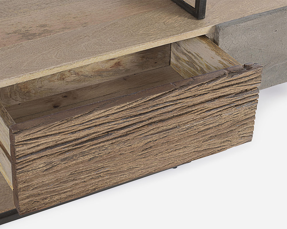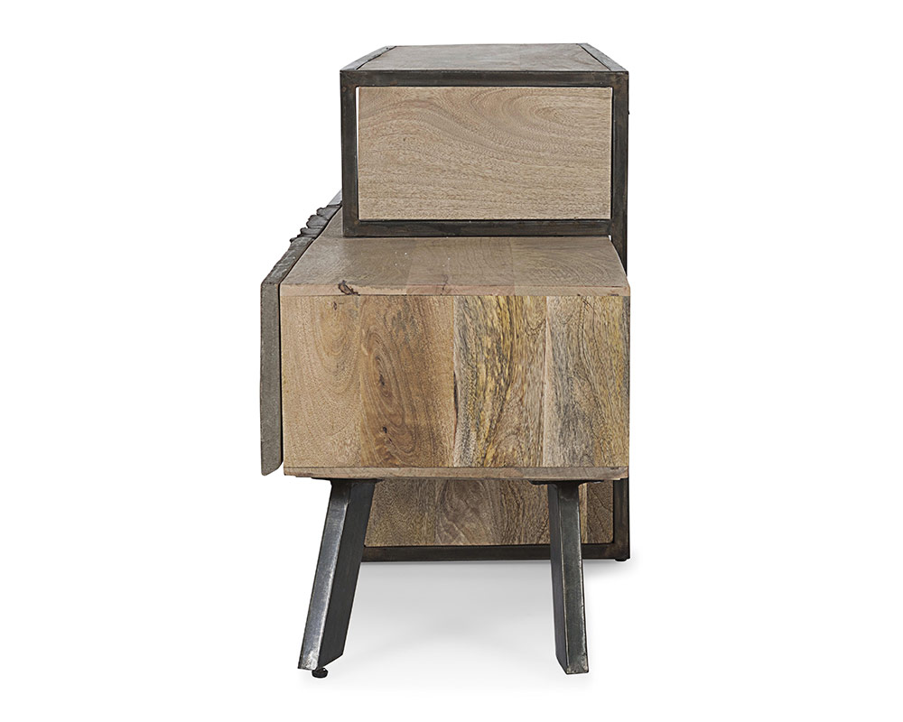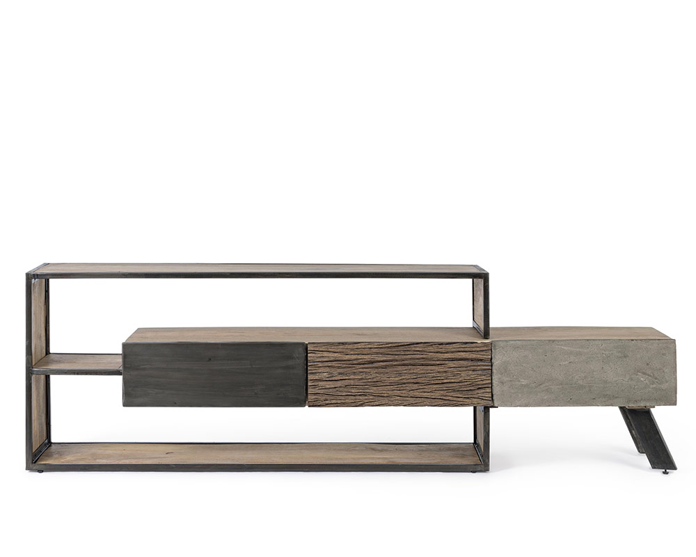 Materiale: Struttura in legno mango ed acciaio, schienale in compensato. frontale ante e cassetti in legno riciclato o lamina di acciaio o finitura in fibra di cemento. finitura acrilica protettiva.