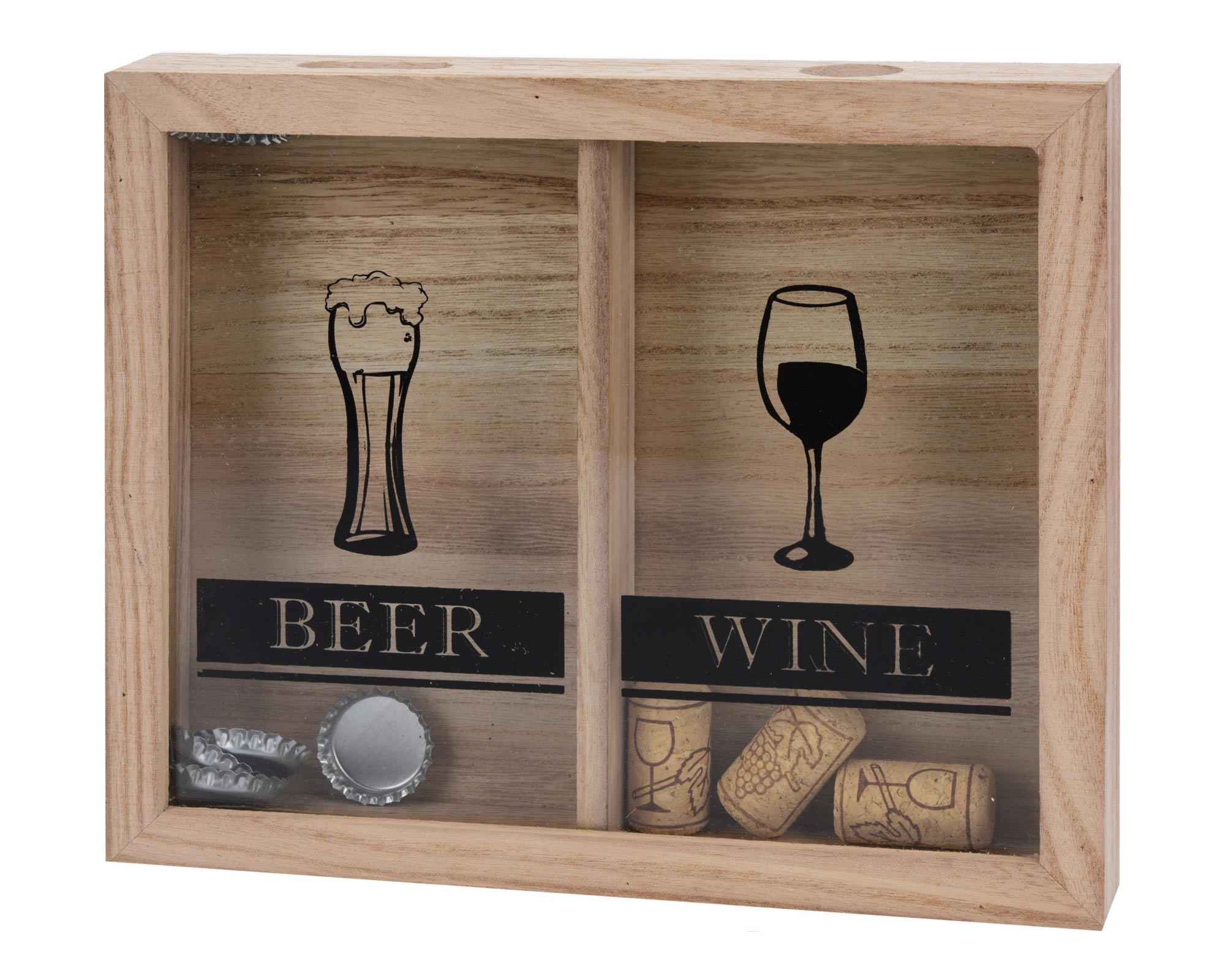 Questo originale raccoglitore di chiusura è suddiviso in 2 parti, il lato sinistro è per tappi di vino e il lato destro per sottobicchieri da birra.