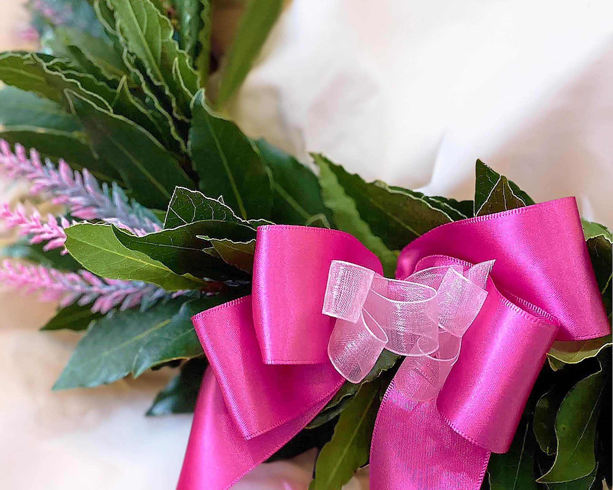 I dettagli sono impeccabili: i nastri di doppio raso fucsia e il delicato tulle rosa aggiungono un tocco di raffinatezza e romanticismo . Inoltre, potete personalizzare la corona con fiocchi elaborati di raso color fucsia e tulle rosa, per enfatizzare ulteriormente l’occasione unica. Ricordatevi di specificare le vostre preferenze durante l’acquisto per garantire una decorazione impeccabile.