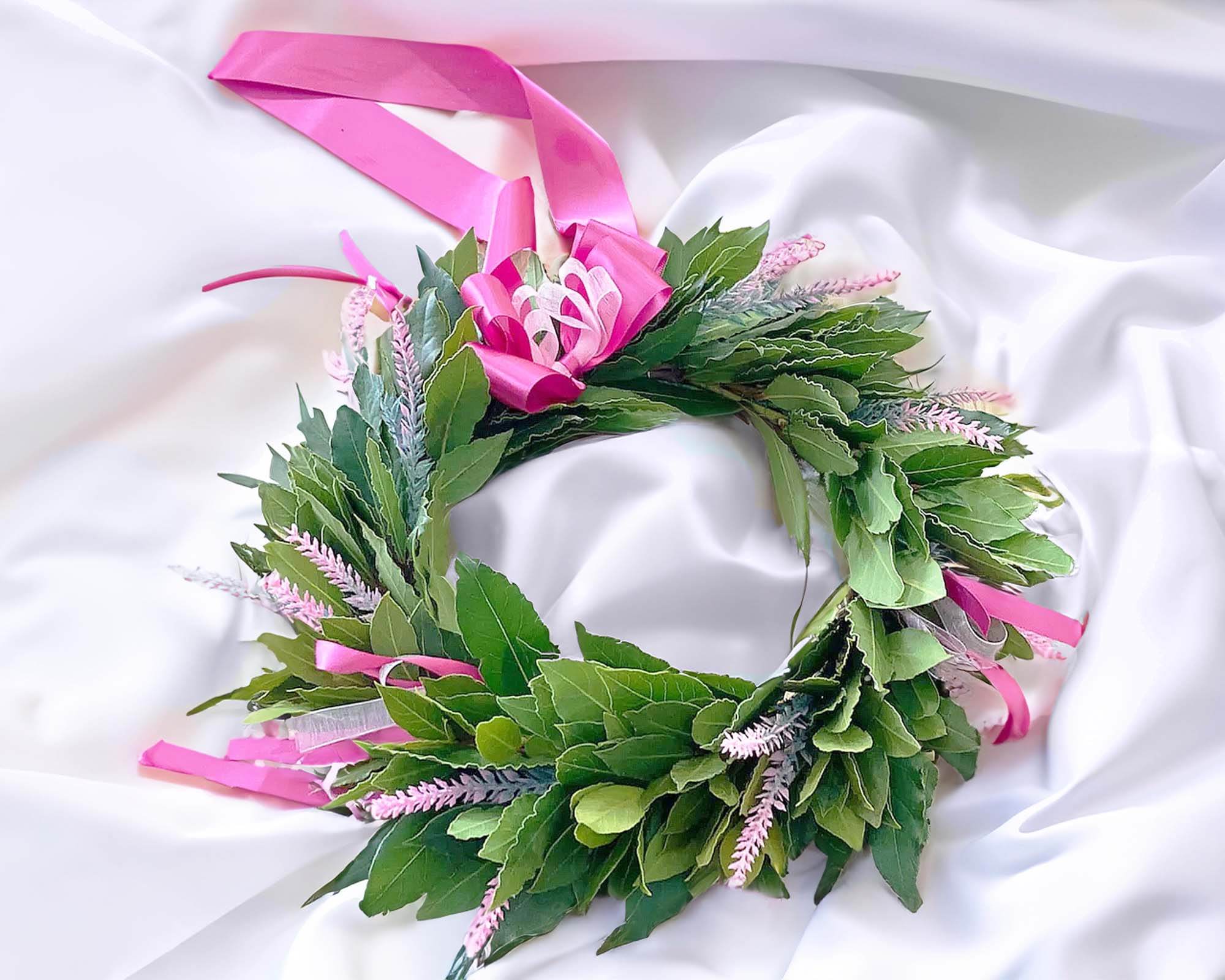La nostra esclusiva Corona di Alloro per Laurea con Erica reciso rosa è un’incantevole dimostrazione di eleganza e gioia celebrativa . Realizzata con cura e maestria, questa corona combina l’ alloro fresco e naturale con graziose fioriture di Erica rosa , creando un suggestivo connubio di colori e profumi .