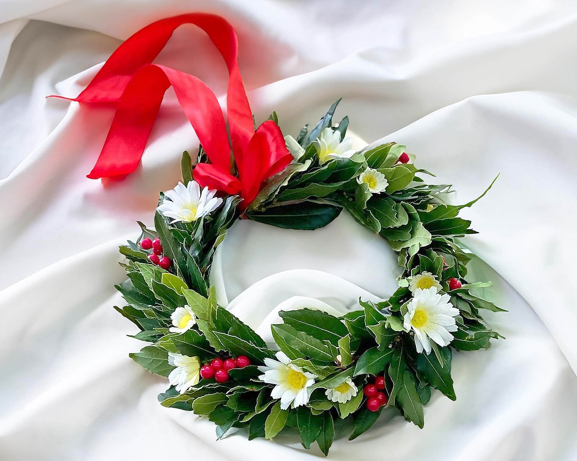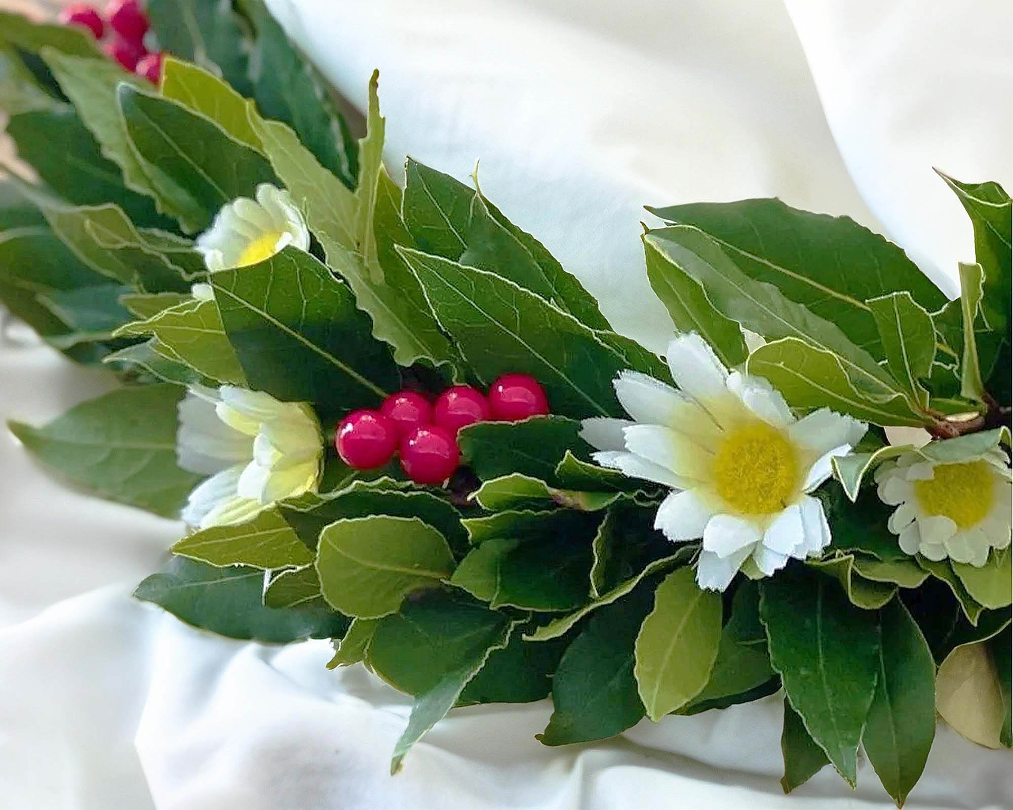 Ogni corona è unica, poiché le bacche possono variare leggermente nel colore e nella forma, ma la qualità è sempre impeccabile. La nostra Corona di Alloro per Laurea è una splendida combinazione di bacche rosse , fresche margherite e un fiocco rosso , simbolo di gioia e celebrazione.