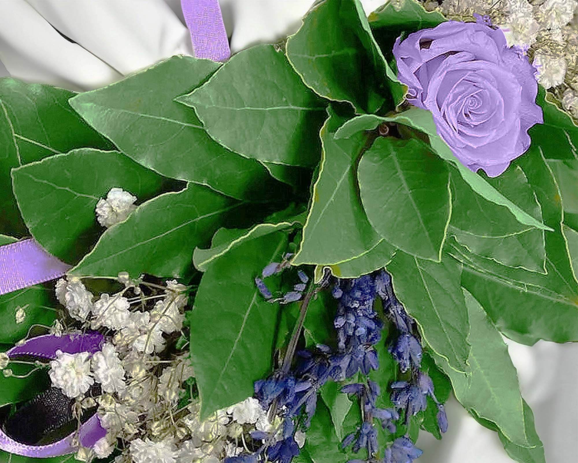 - Composizione: Alloro, Roselline Violette, Lavanda, Gipsofila e Nastro