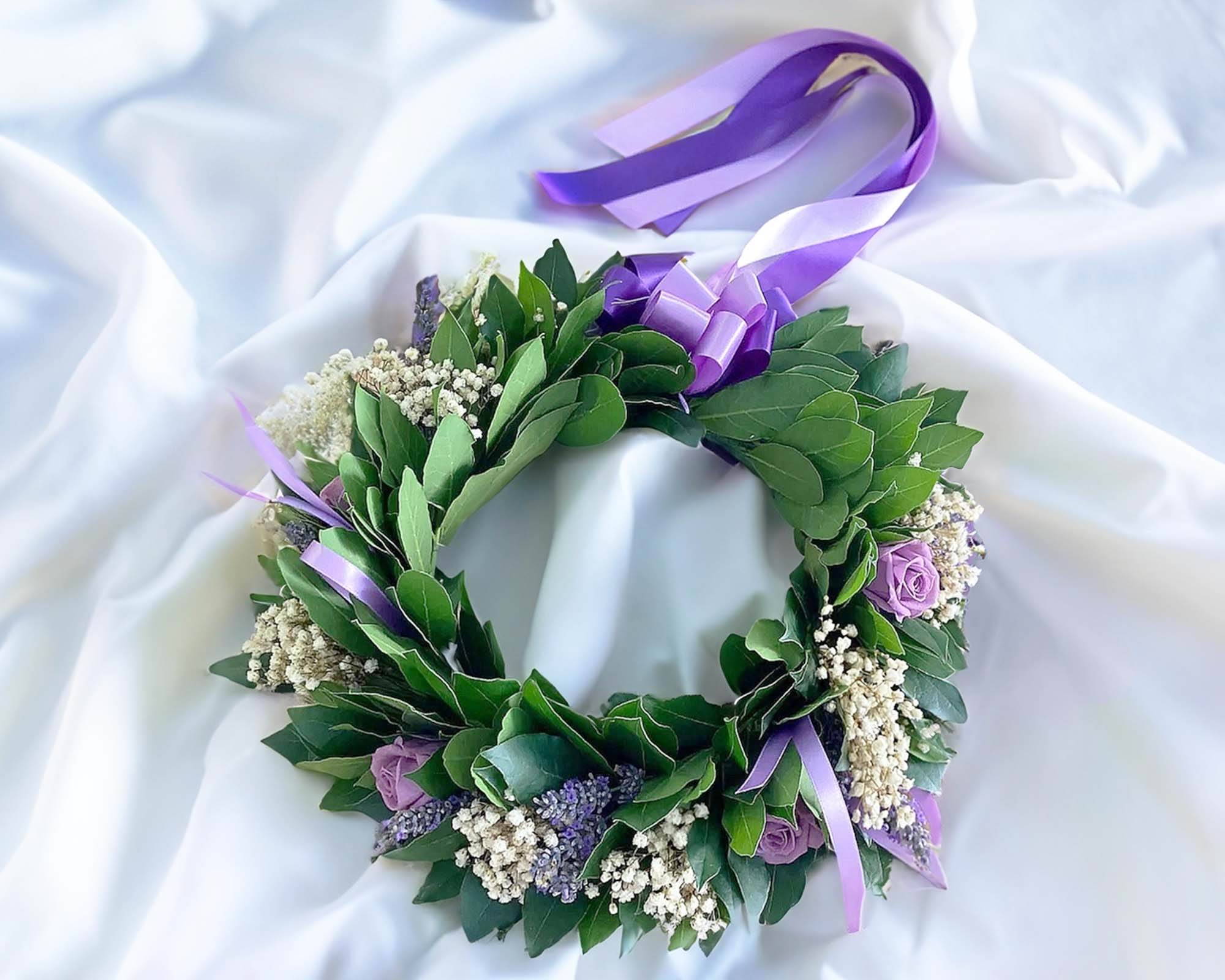 Corona di Alloro per Laurea con Roselline Violette, Lavanda e Gipsofila