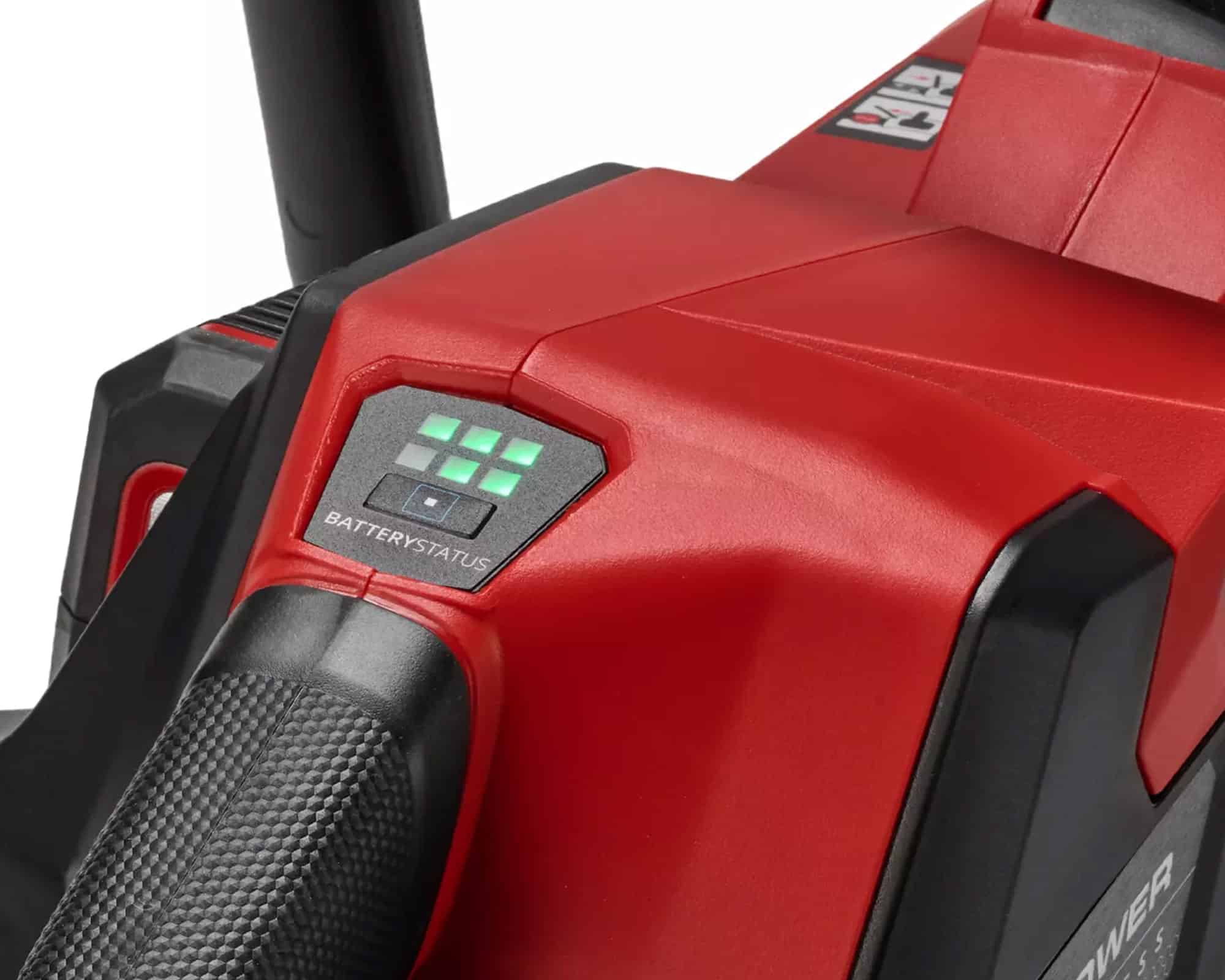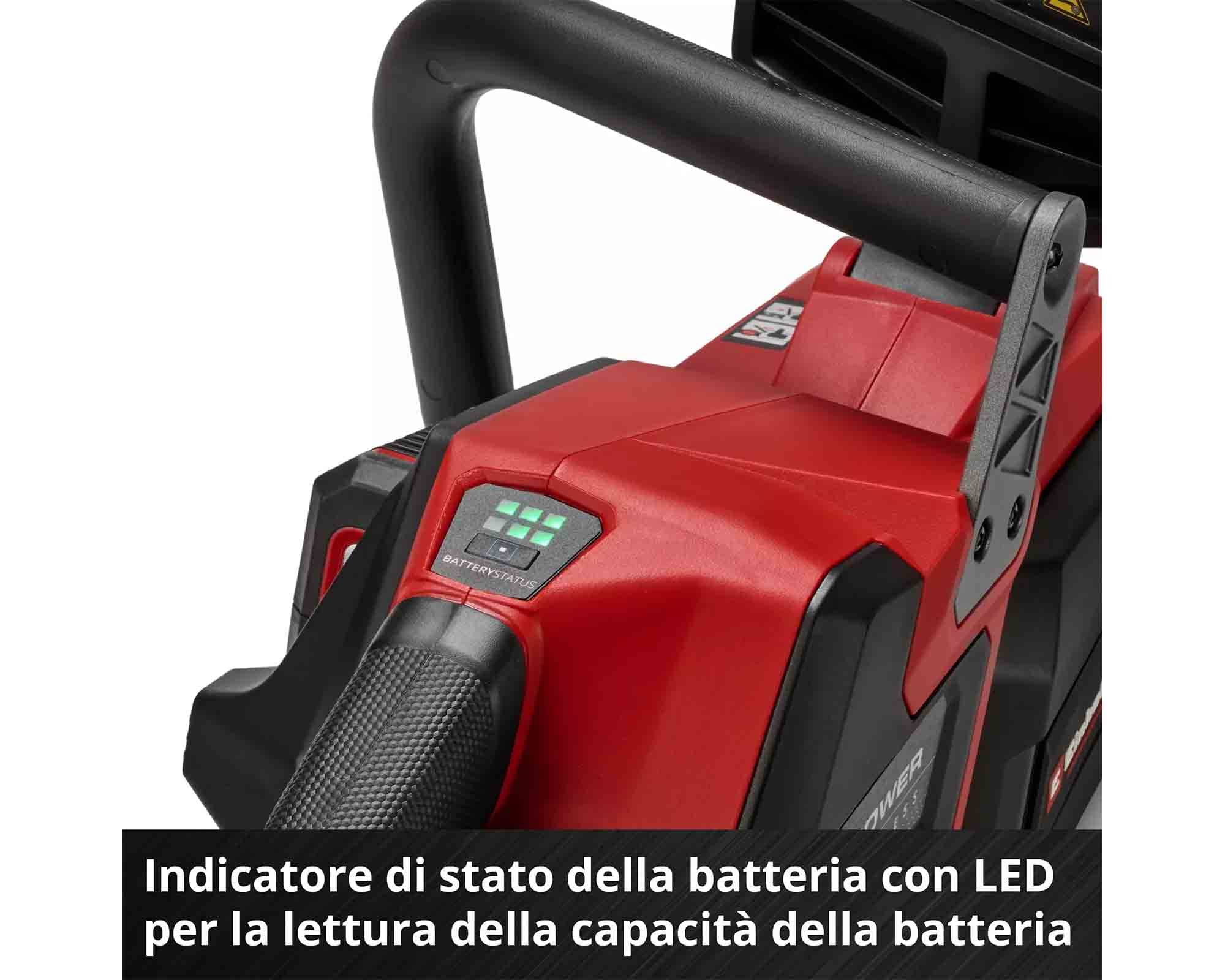 Un pratico indicatore LED a 3 livelli mostra in tempo reale lo stato di carica delle batterie installate. Per ottimizzare la maneggevolezza, le batterie sono posizionate lateralmente, garantendo sia una protezione efficace che un bilanciamento ideale della motosega durante l’uso.