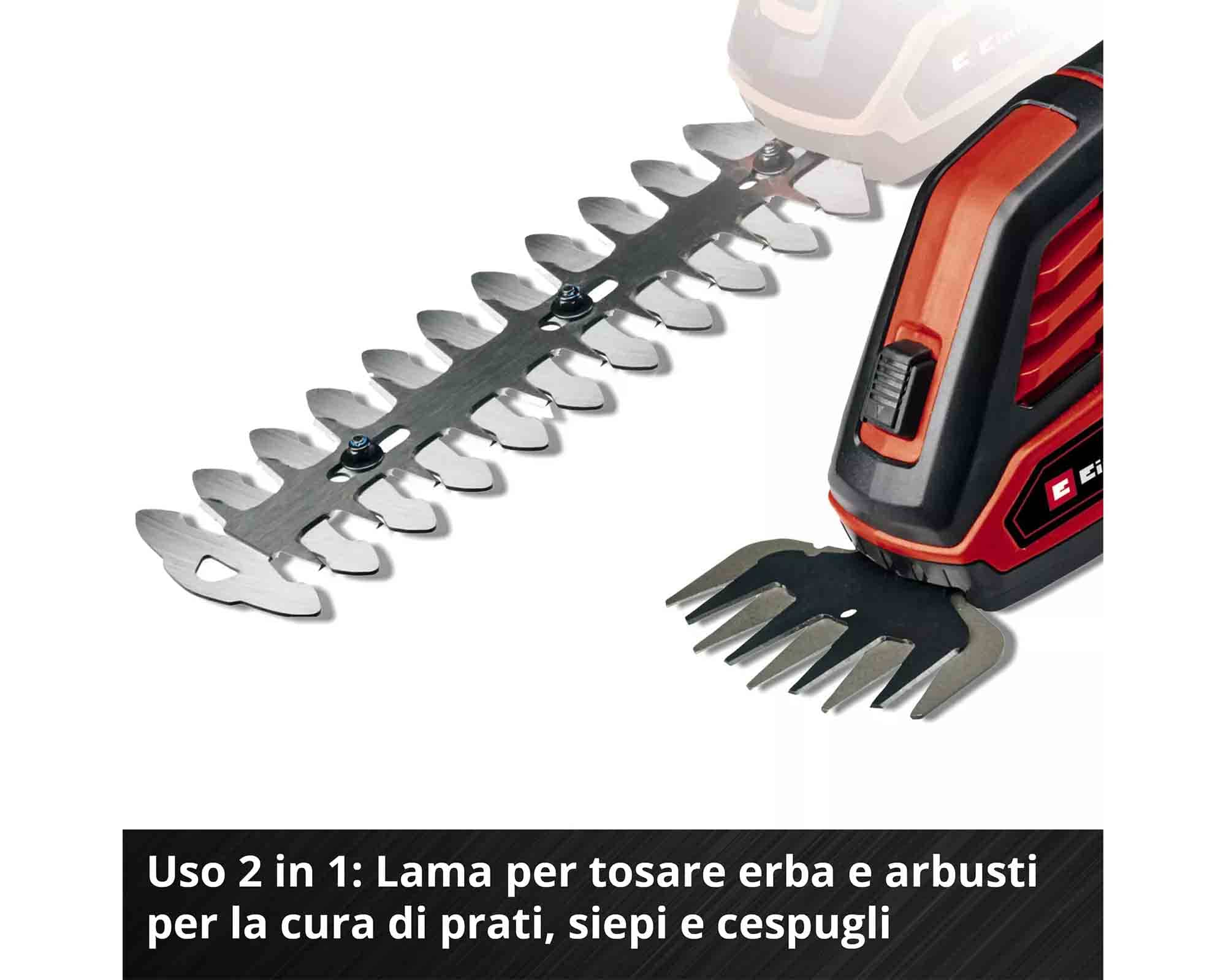 Dotata di una lama per erba da 100 mm, è perfetta per la rifinitura dei bordi del prato, mentre le lame tagliasiepi, tagliate al laser e affilate con tecnologia diamantata, garantiscono un taglio netto e preciso su siepi e cespugli.