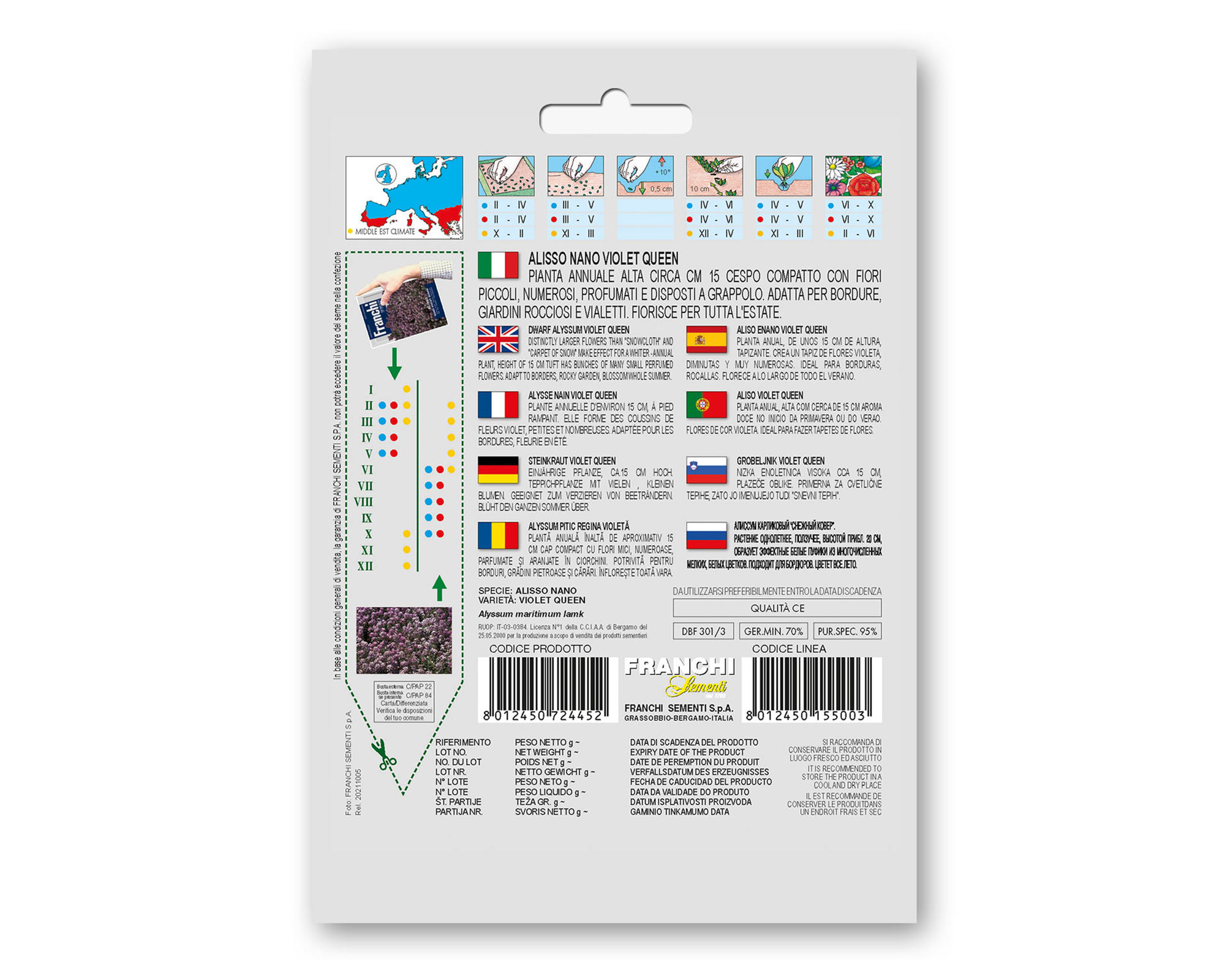 Semi di Alisso Nano Violet Queen – di FRANCHI SEMENTI. Pianta annuale alta circa cm.15. Cespo compatto con fiori piccoli, numerosi, profumati e disposti a grappolo. Adatta per bordure, giardini rocciosi e vialetti. Fiorisce per tutta l’estate.