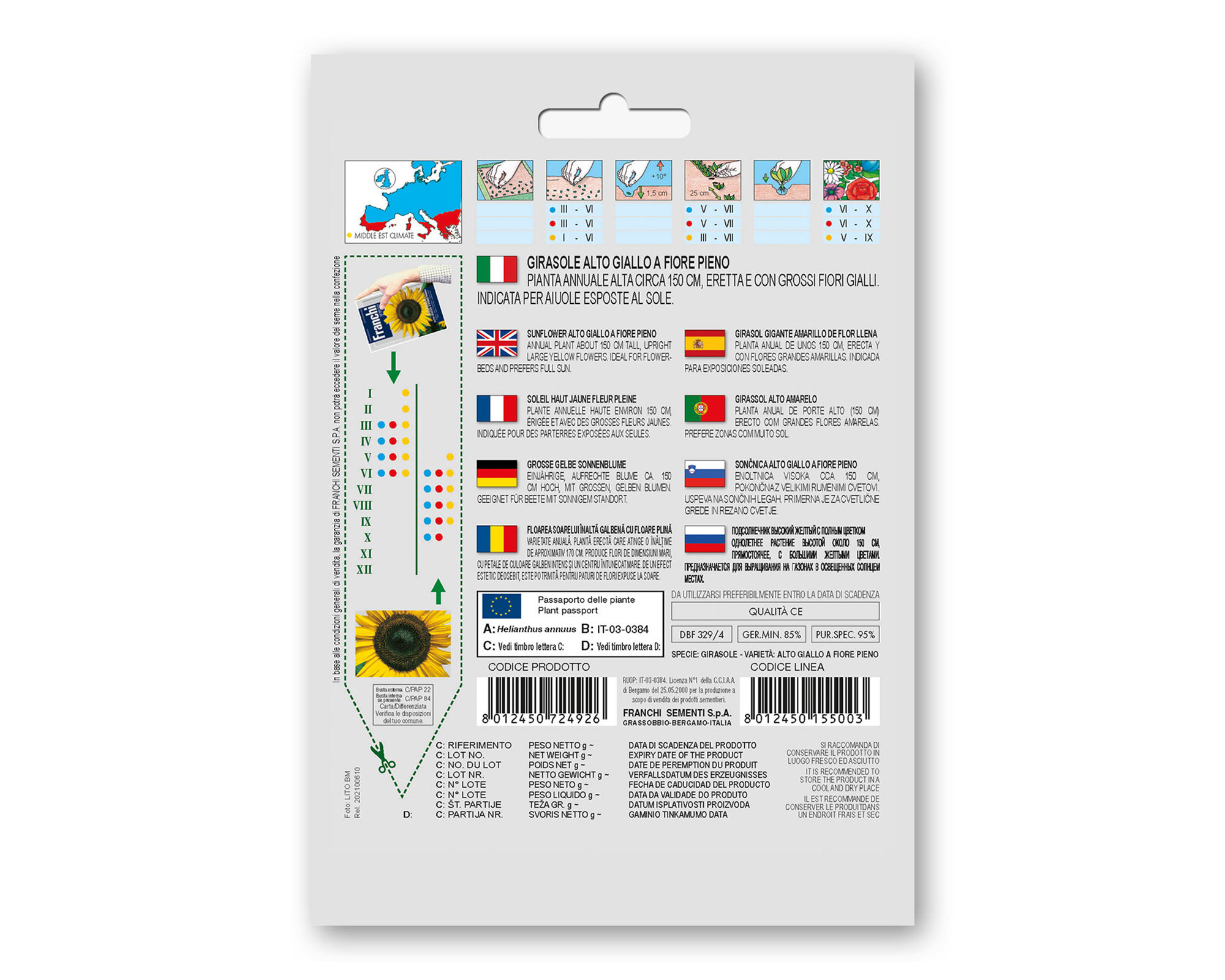 Semi di Girasole Alto Giallo a Fiore Pieno – di FRANCHI SEMENTI. Varieta’ annuale. Pianta eretta che raggiunge l’altezza di circa 170 cm. Produce fiori di grandi dimensioni, con petali di colore giallo intenso e grande centro scuro. Di grande effetto estetico ed è indicata per aiuole
