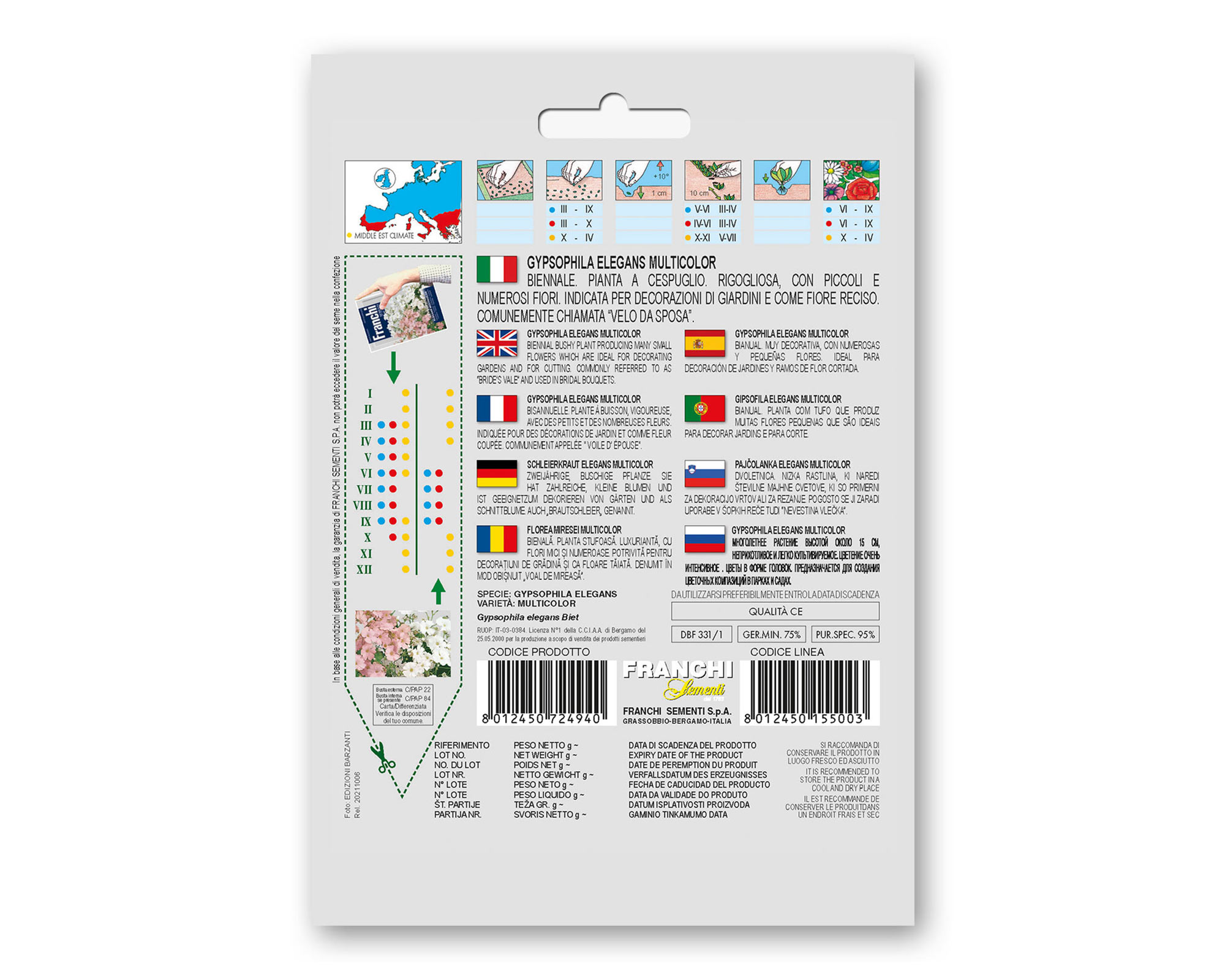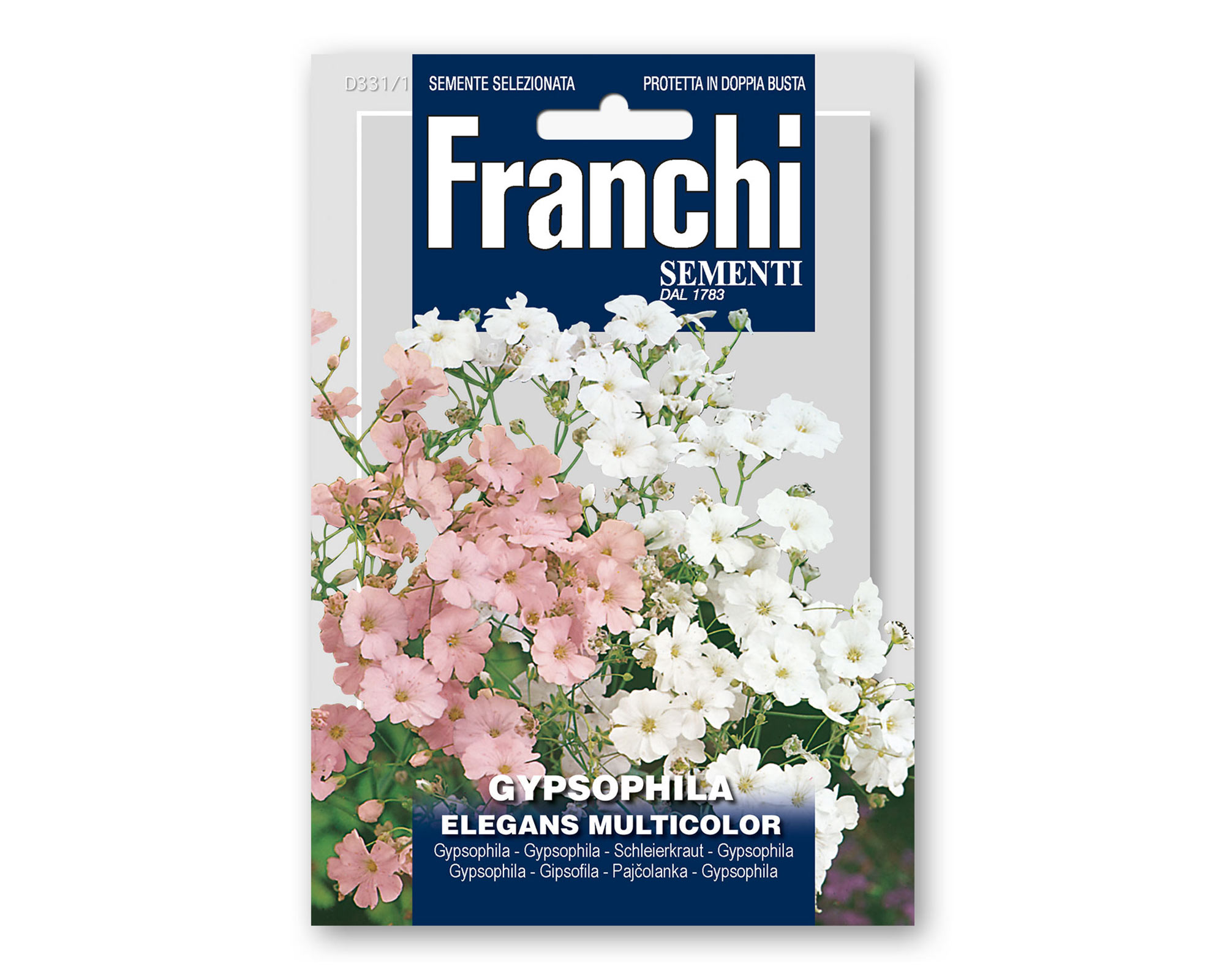 Semi di Gypsophila Elegans Multicolor – di FRANCHI SEMENTI. Biennale. Pianta a cespuglio. Rigogliosa, con piccoli e numerosi fiori. Indicata per decorazioni di giardini e come fiore reciso. Comunemente chiamata “velo da sposa”.