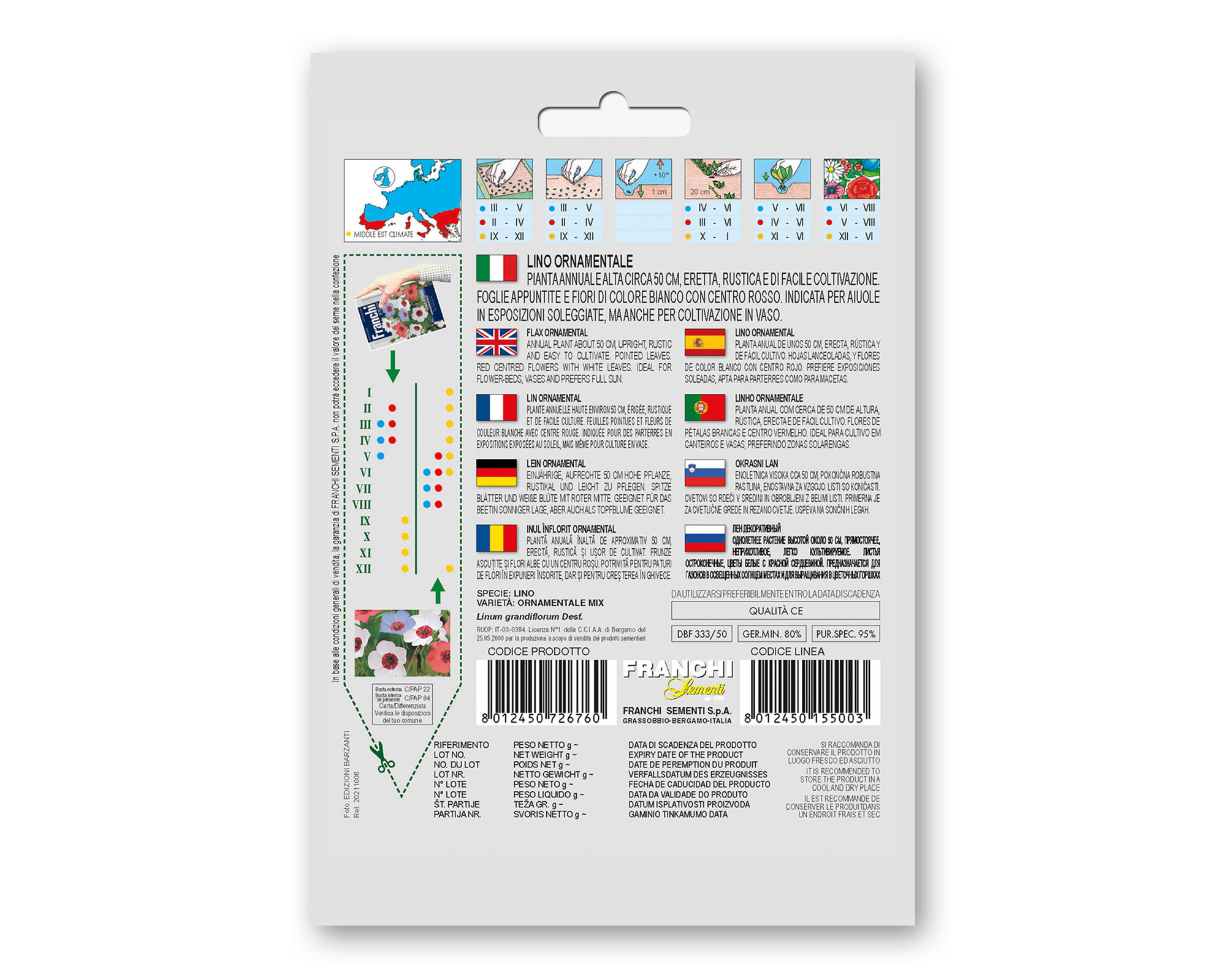 Semi di Lino Ornamentale – di FRANCHI SEMENTI. Pianta annuale alta circa 50 cm, eretta, rustica e di facile coltivazione. Foglie appuntite e fiori di colore bianco con centro rosso. Indicata per aiuole in esposizioni soleggiate, ma anche per coltivazione in vaso.