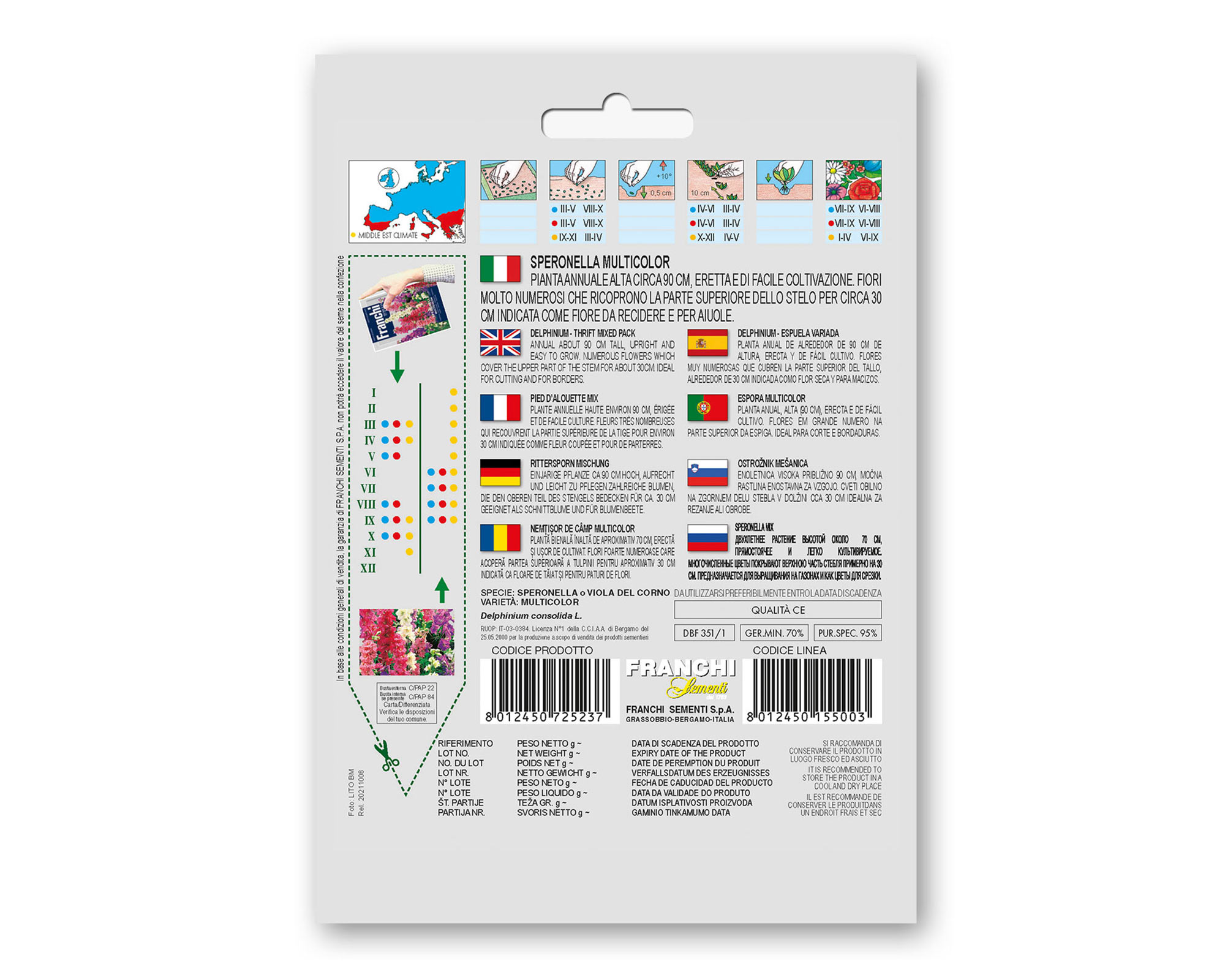 Semi di Speronella Multicolor – di FRANCHI SEMENTI. Pianta biennale alta circa 70cm, eretta e di facile coltivazione. Fiori molto numerosi che ricoprono la parte superiore dello stelo per circa 30 cm. indicata come fiore da recidere e per aiuole.