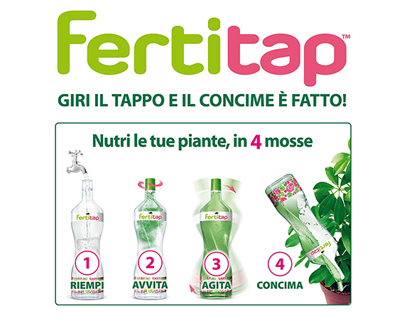 FERTITAP è l’innovativo sistema di concimazione indicato per nutrire in modo completo, facile e veloce tutte le piante verdi e fiorite coltivate in vaso, sia in interno che in ambienti esterni. Specificamente sviluppata con caratteristiche di resistenza superiori, è dotata di impugnatura ergonomica e collo allungato per un più agevole inserimento tra le fronde delle piante in vaso. La bottiglia annaffiatoio si acquista una volta sola. I tappi FERTITAP, coperti da brevetto, sono disponibili nelle 2 varianti per piante verdi e piante fiorite. Contengono concimi di qualità professionale già perfettamente dosati per creare 1,5 l di soluzione nutriente all’interno della bottiglia annaffiatoio. La soluzione preparata con la bottiglia FERTITAP è idonea a concimare circa 5-6 vasi dal diametro tra i 20 e i 25 cm.