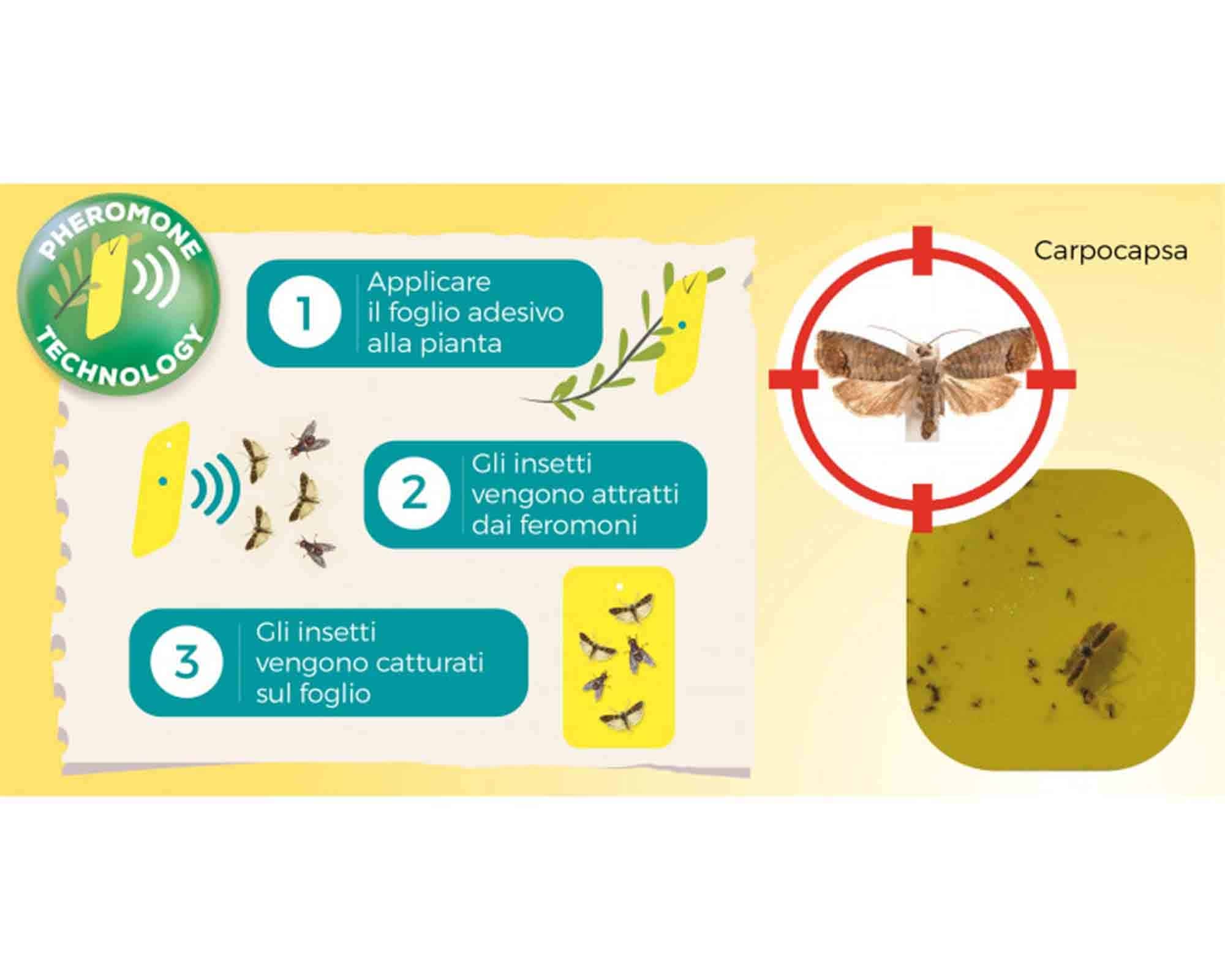 La trappola agisce grazie a una doppia azione attrattiva: il colore giallo, che richiama naturalmente gli insetti, e la presenza di feromoni di attrazione specifici, studiati per colpire esclusivamente gli insetti target. Una volta attratti, gli insetti restano catturati sul foglio adesivo, consentendo un controllo visivo immediato del livello di infestazione.