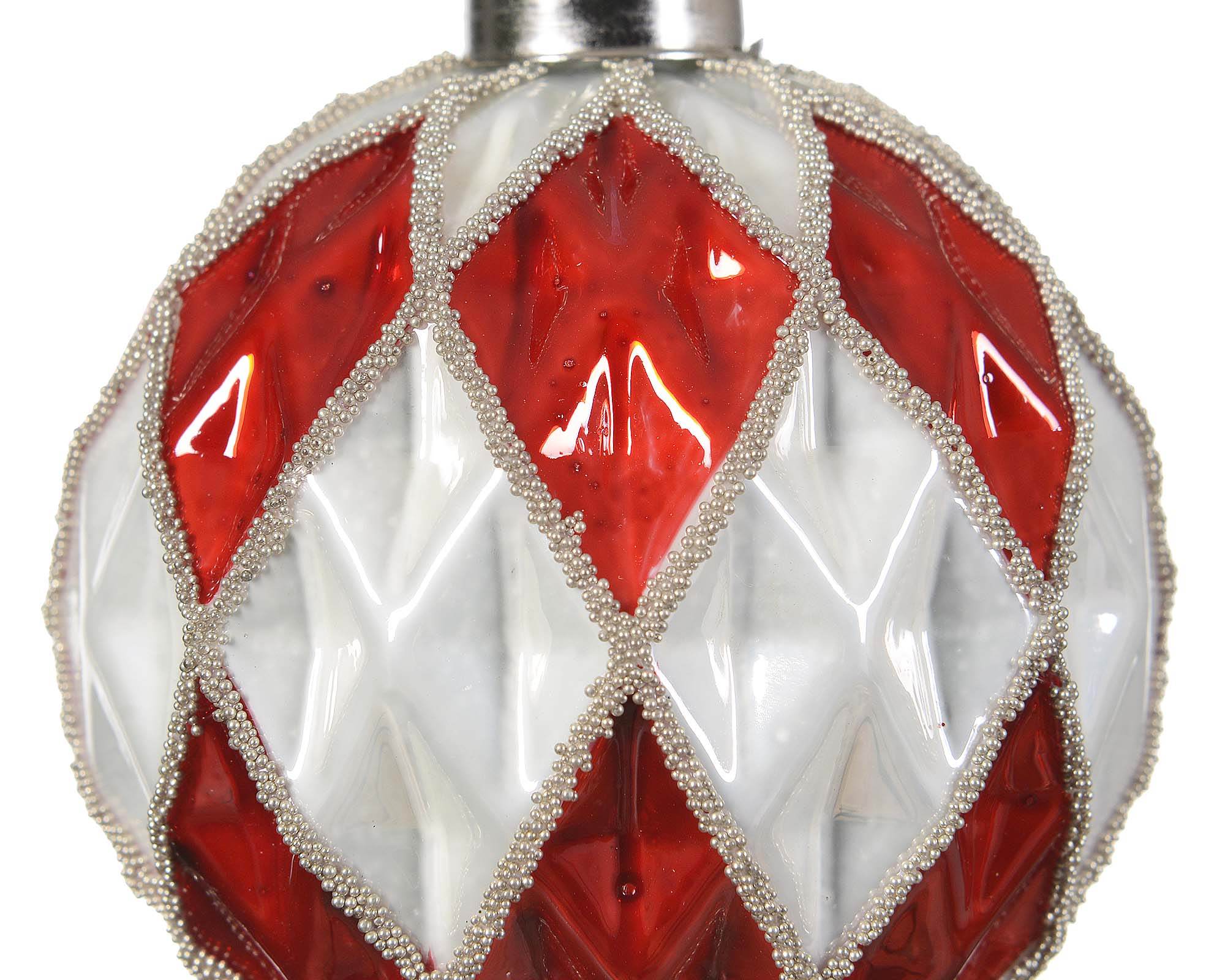 Realizzata in vetro di alta qualità, questa decorazione sferica cattura la luce in modo magico, creando giochi di riflessi e atmosfere avvolgenti. Il bicolore rosso e bianco aggiunge un tocco di vivacità e contrasto, perfetto per aggiungere un pizzico di audacia alla tua decorazione.