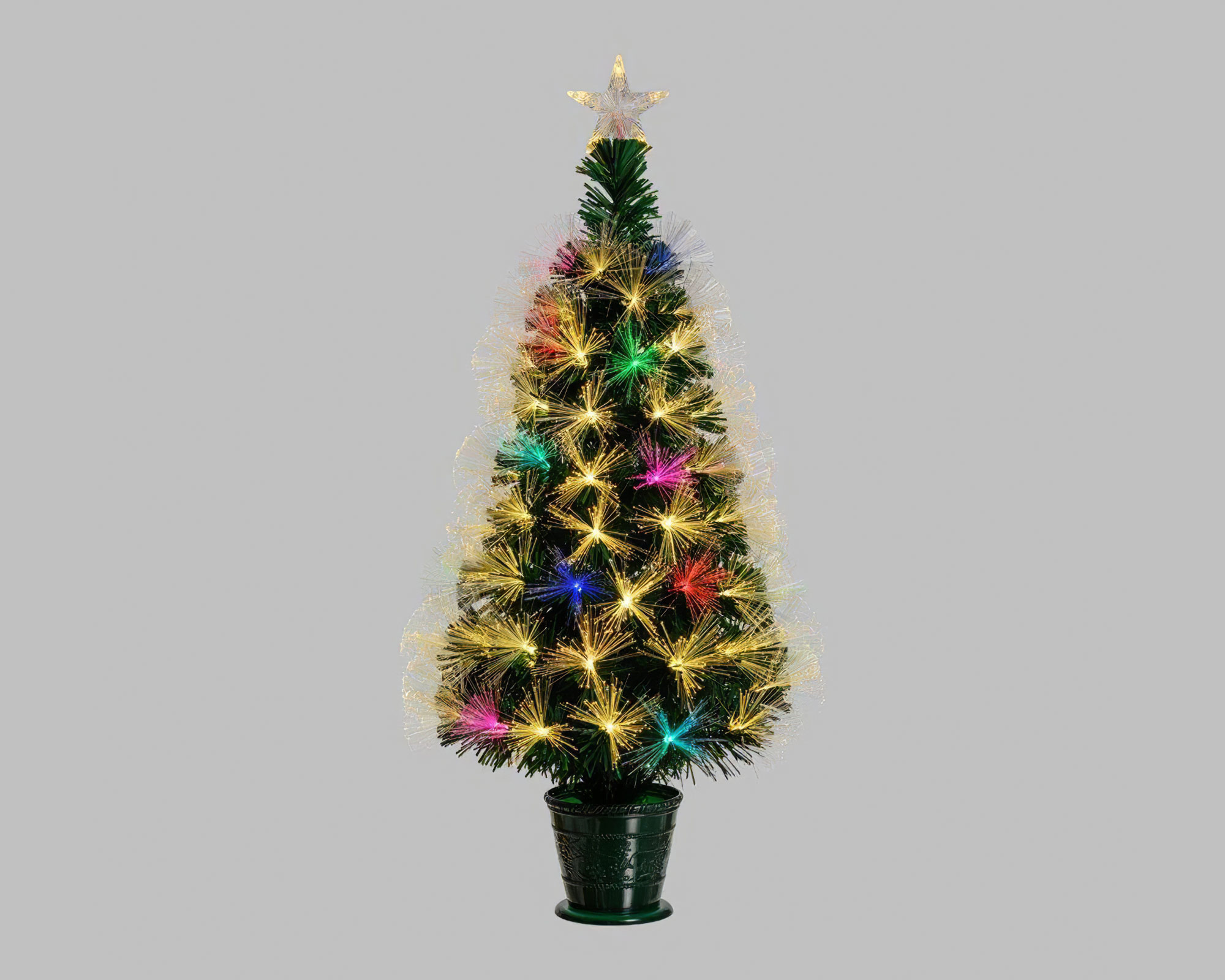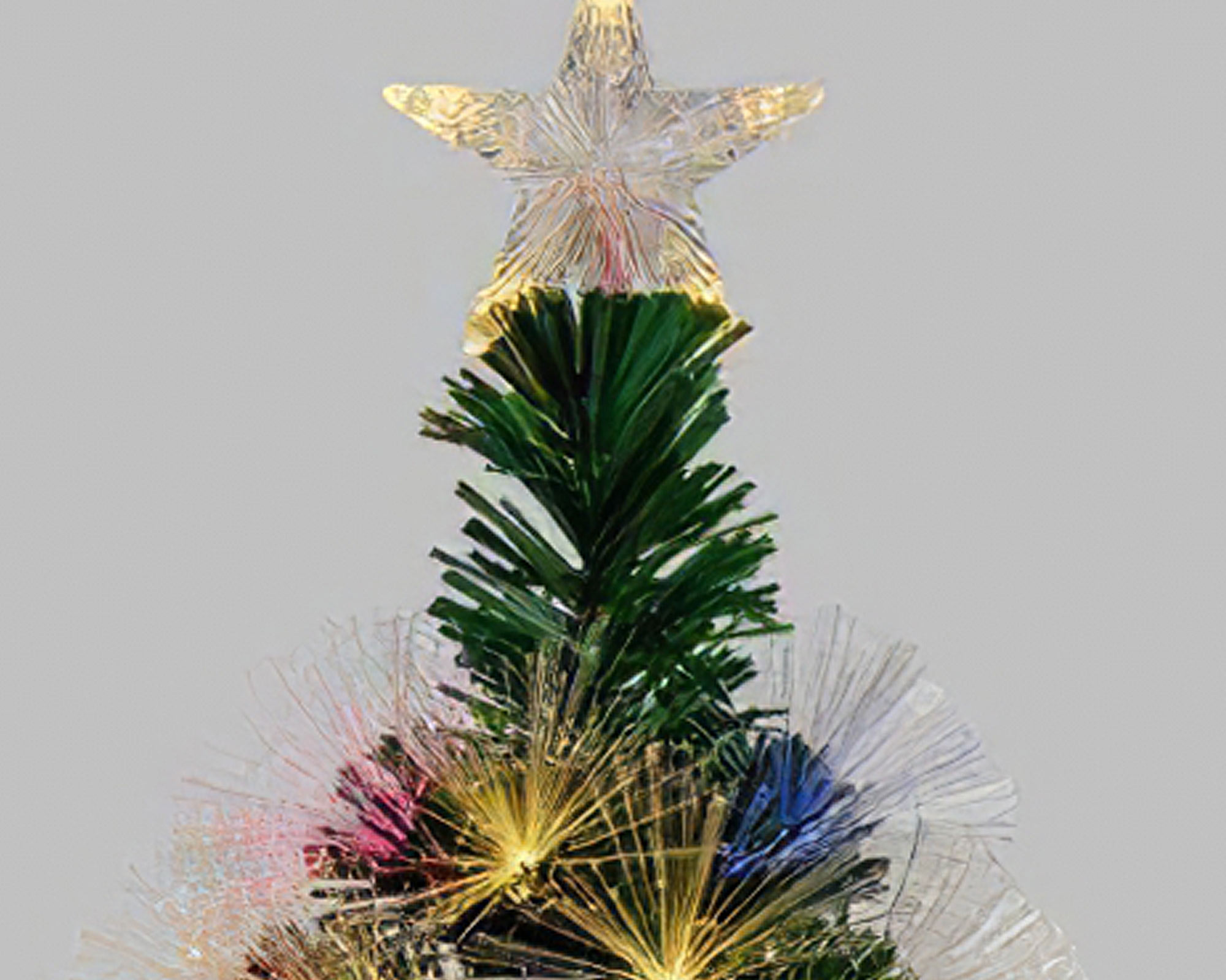 L’albero è composto da tanti ciuffi di fibre ottiche sfumate bianco caldo a luce fissa e da alcuni ciuffi di fibre ottiche sfumate illuminate da led RGB cambiacolore.