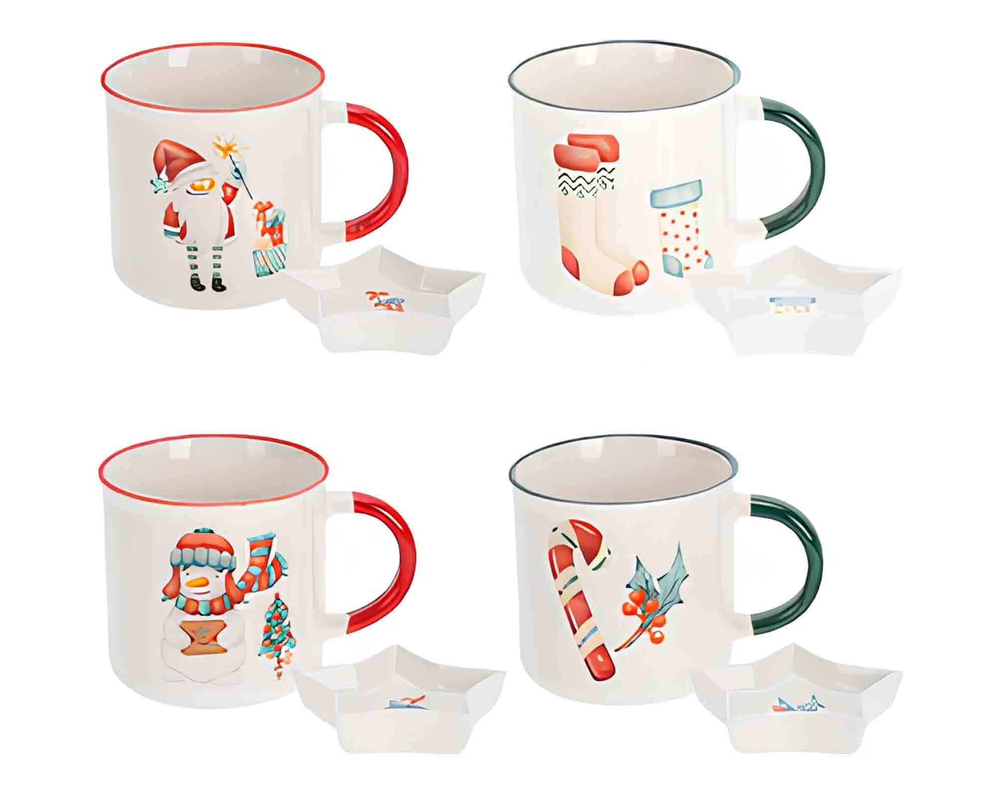 Rendi le tue pause calde e festive con questo set di 4 tazze con piattino a tema natalizio, perfette per servire caffè, tè, tisane o cioccolata calda durante il periodo delle feste. Ogni pezzo presenta un decoro natalizio unico, aggiungendo colore e allegria alla tua tavola.