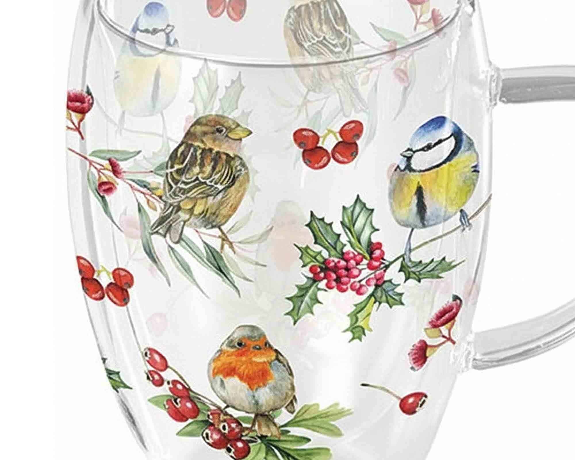 Tazza Natalizia Doppia Parete con Bacche e Uccelli da 350ml in Vetro
