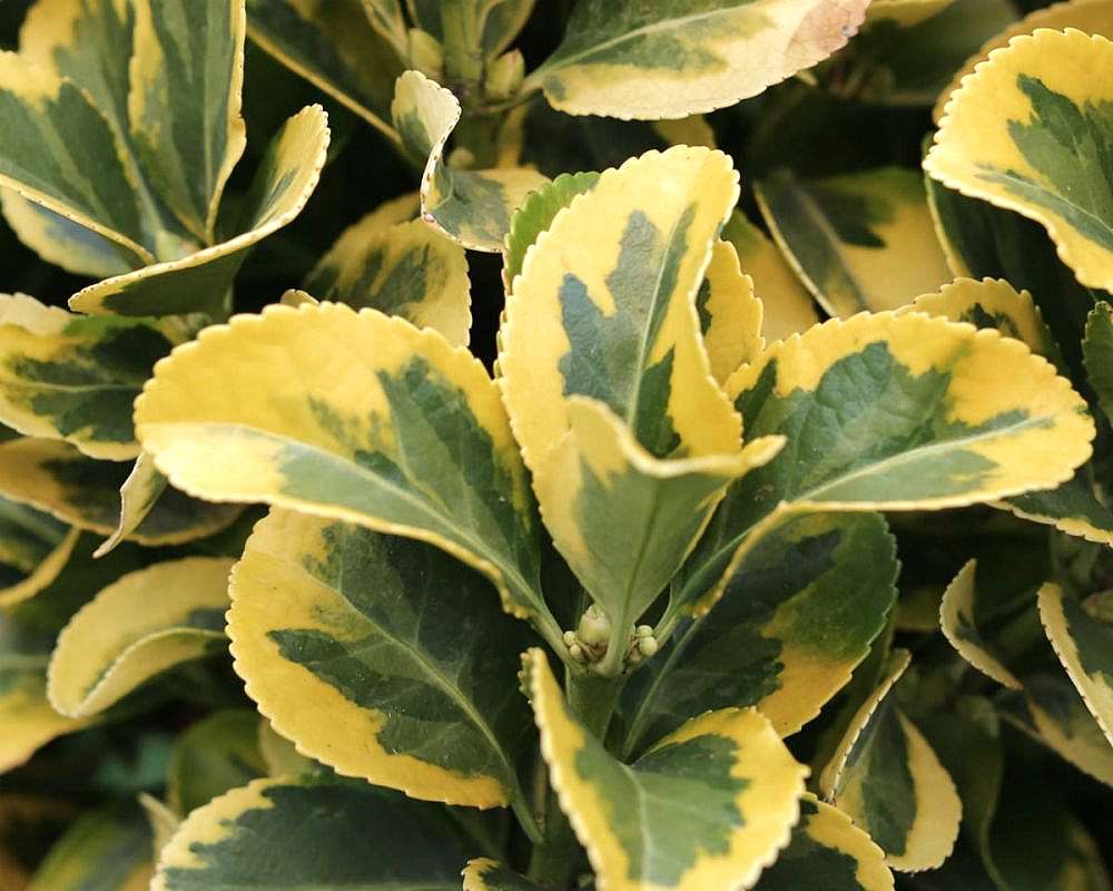 Euonymus japonicus aurea definito evonimo del Giappone è un arbusto folto, cespuglioso, sempreverde con foglie opposte da obovate a strettamente ovali, dentate, coriacee, lucenti dall’ interno verde scuro interno e larghi margini dorati, lunghe fino a 6 cm.