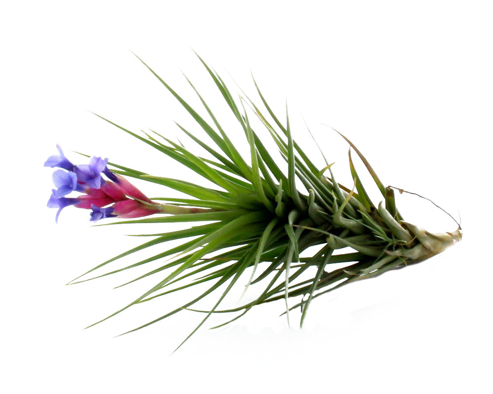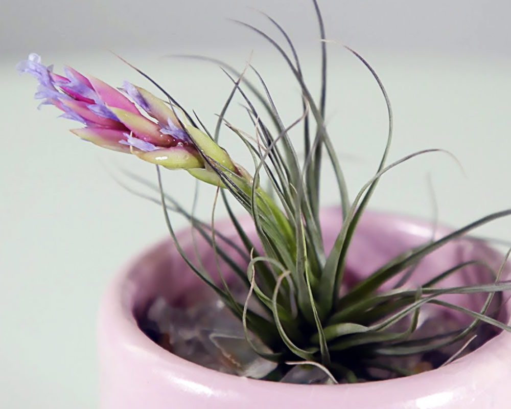 La tillandsia è una pianta aerea e la loro caratteristica comune è quella di non avere radici assorbenti e di sfruttare l’altezza di altre piante. Oppure utilizzare le corte radici avventizie per ancorarsi a supporti diversi. Per questa caratteristica vengono anche chiamate airplants. Sono originarie del centro e sud America e si sono evolute per assorbire l’acqua dalle foglie mediante delle strutture simili ad imbuti. Possono vivere appese a fili di nylon o di rame, ancorate alle pareti di casa, sospese graziee a strutture di sostegno. Le potete anche appoggiare a una mensola o a un tavolo