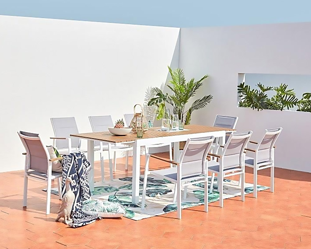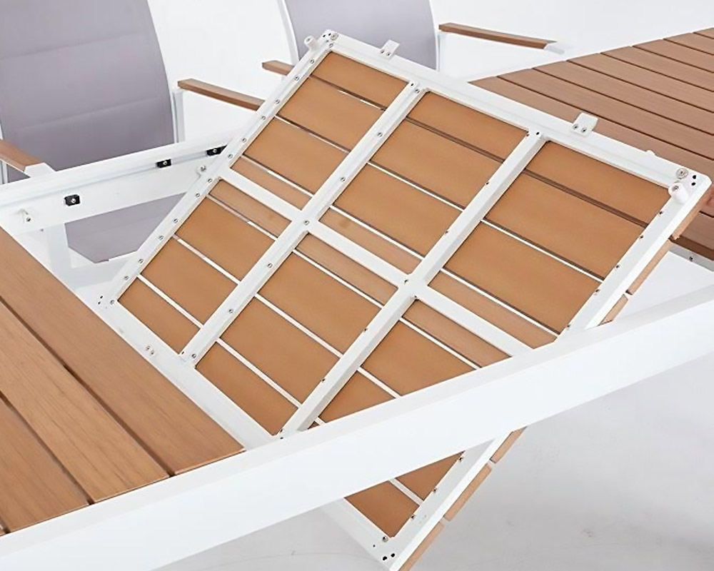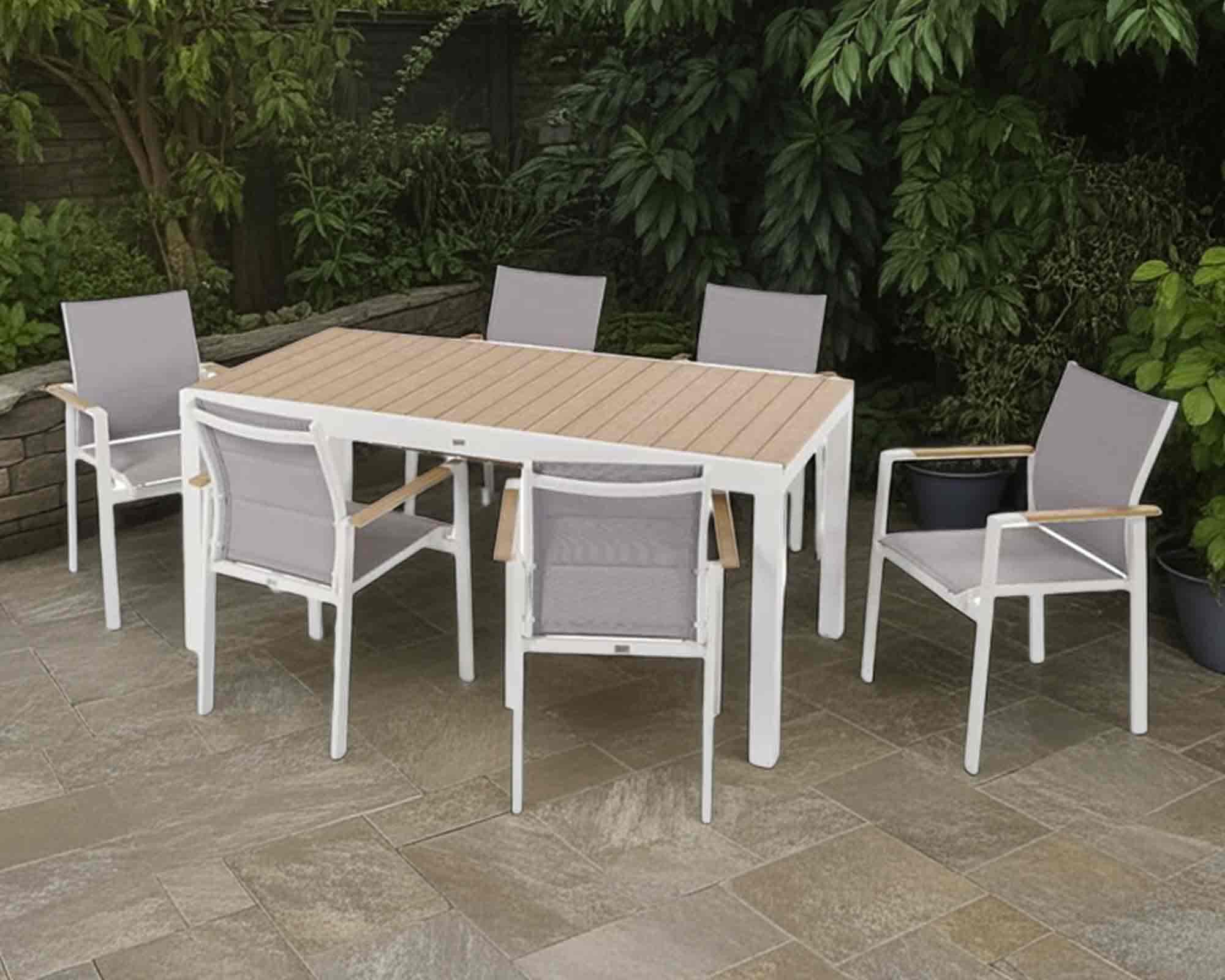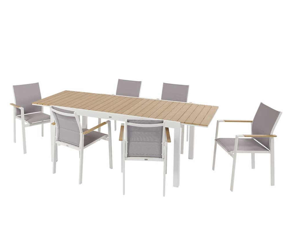 Set composto da 1 tavolo allungabile in polywood + 6 sedie con braccioli textilene grigio chiaro