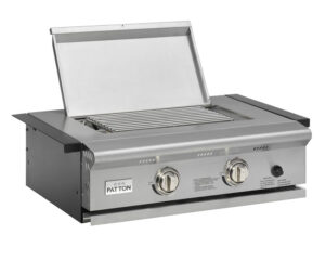 Blocco cottura da incasso Patton Patron in acciaio inox. Questo blocco cottura è dotato di 2 bruciatori a doppia corona in acciaio inox con accensione elettronica. La parte superiore di questo modulo è completamente in acciaio inossidabile e presenta un parabrezza ribaltabile.