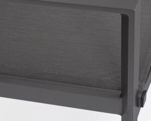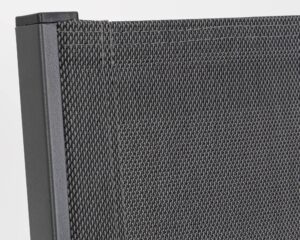 Le sedute e gli schienali sono realizzati in textilene 2×1, un materiale innovativo che offre un comfort superiore grazie alla sua elasticità e traspirabilità. Il textilene è resistente agli agenti atmosferici e agli UV, garantendo una lunga durata senza sbiadire o deformarsi. Con il suo design ergonomico e la sua resistenza agli agenti esterni, il textilene assicura un comfort ottimale per lunghe ore di relax all’aria aperta.
