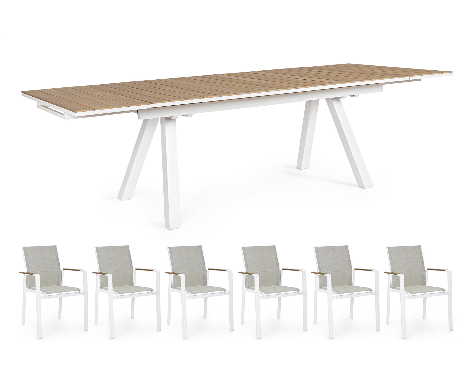 Il set da pranzo Cuddle è composto da un tavolo allungabile in alluminio grigio antracite, dalle dimensioni 200×96 cm che possono essere estese fino a 300×96 cm, e sei sedie in alluminio grigio. Le sedie sono robuste e confortevoli, con schienali alti e braccioli in grado di offrire un supporto adeguato durante i pasti all’aperto. Il tavolo dispone di una superficie in alluminio resistente alle intemperie, facile da pulire e con un design moderno che si adatta a qualsiasi ambiente esterno.