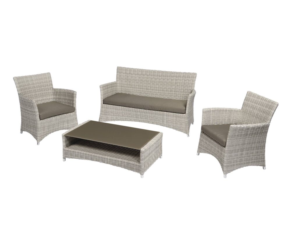 Il rivestimento dal motivo intrecciato, mantiene il fascino della fibra sinteticae della lavorazione artigianale, combinandolo con i vantaggi della fibra sintetica: il vostro set manterrà la sua bellezza nel tempo, grazie alla resistenza agli agenti atmosferici e ai raggi UV.
