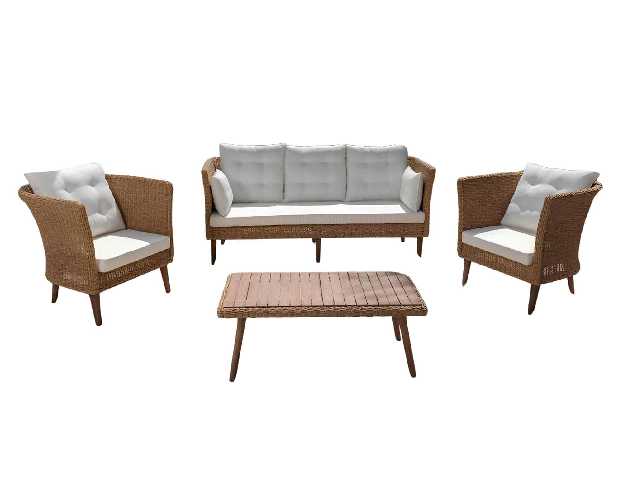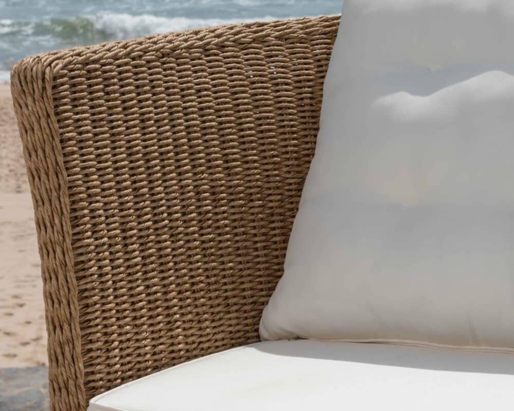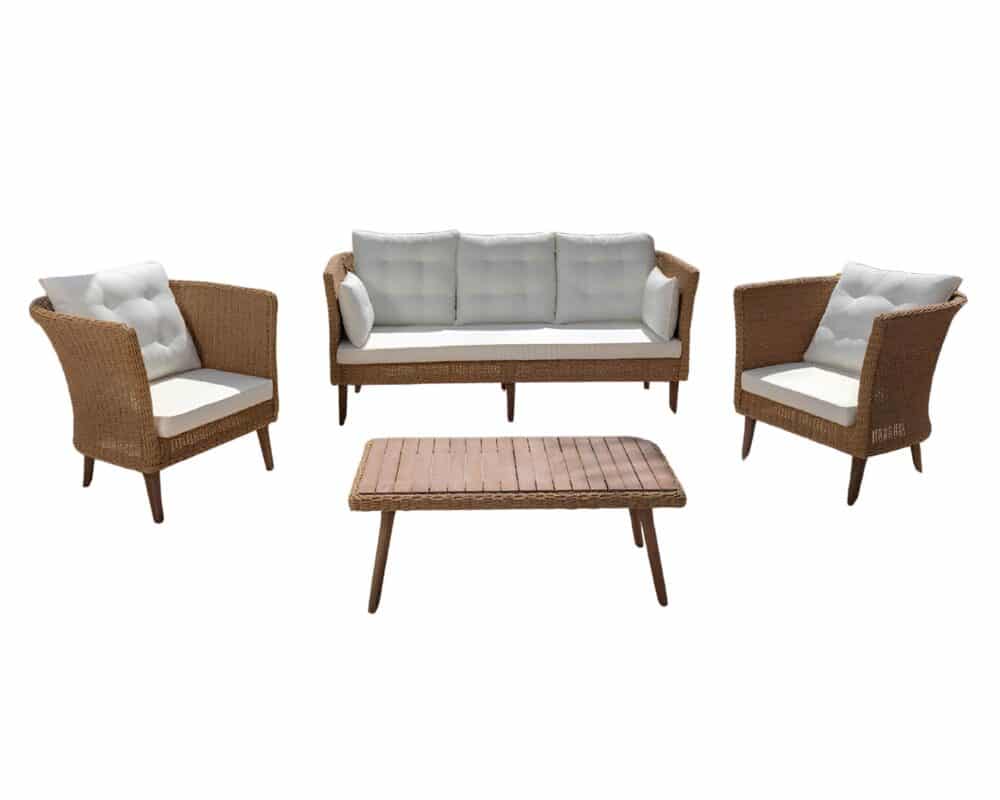 La struttura è realizzata in legno con inserti in polyrattan, un materiale sintetico intrecciato che richiama l’estetica naturale del rattan ma con maggiore resistenza agli agenti atmosferici. La combinazione dei materiali conferisce al set un design moderno, ma dal sapore accogliente e caldo.