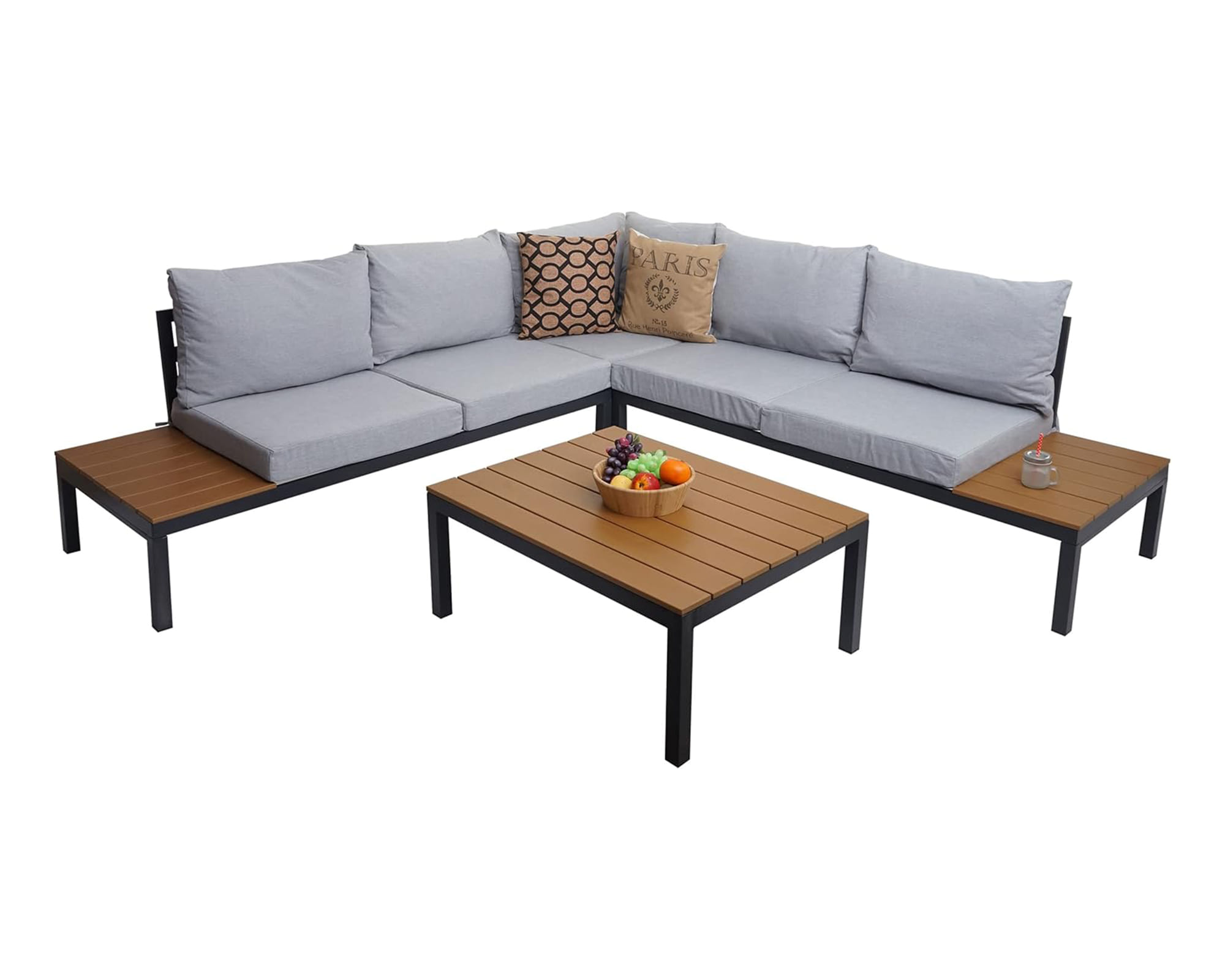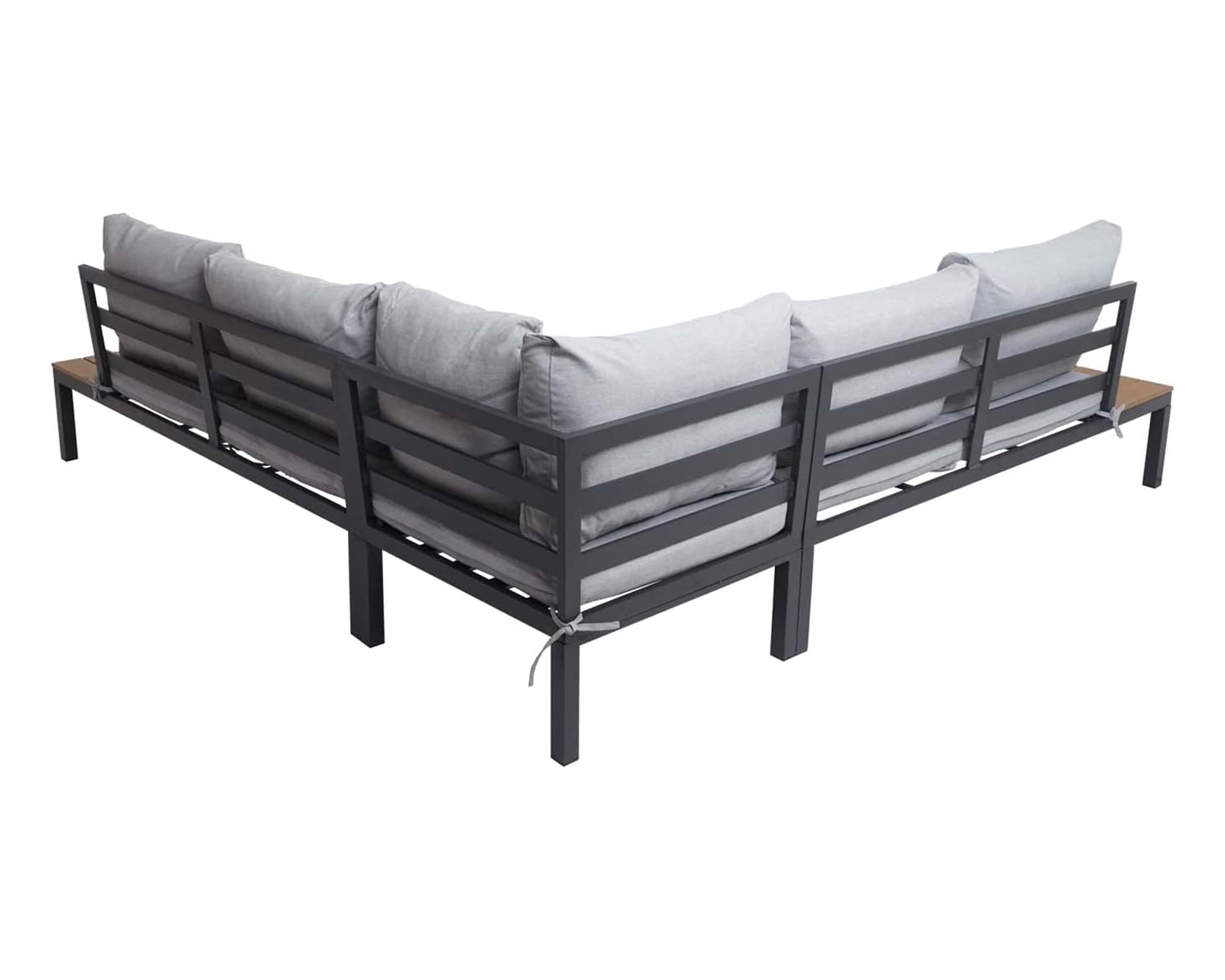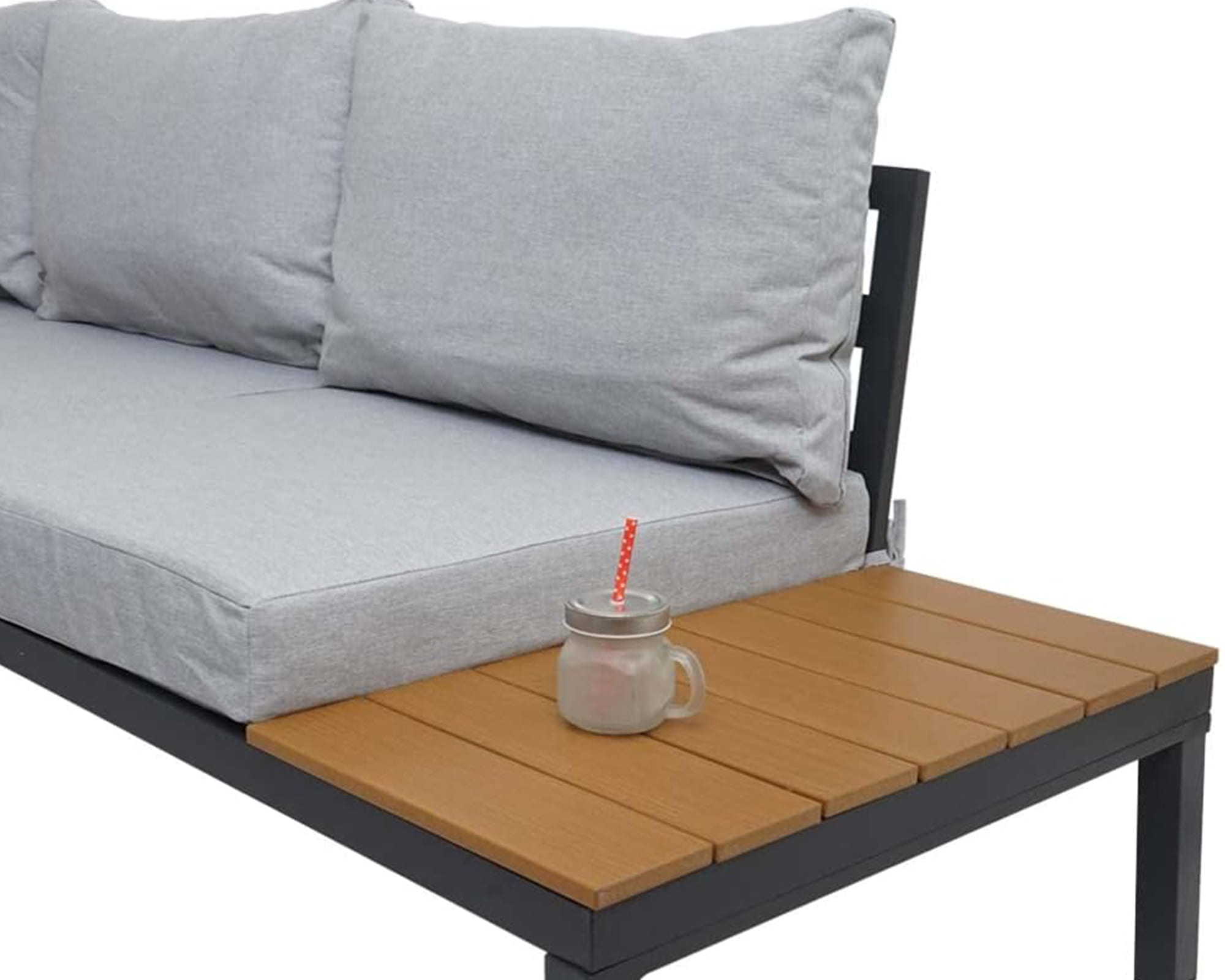 La struttura in alluminio garantisce leggerezza e durabilità, resistendo alle intemperie e alla corrosione, mentre il legno di teak aggiunge un tocco di calore e naturalezza. I cuscini spessi e comodi sono realizzati con tessuti di alta qualità, resistenti ai raggi UV e all’umidità, assicurando un comfort duraturo. Ogni pezzo del set è progettato per offrire il massimo del comfort e della praticità, con linee pulite e una costruzione solida.
