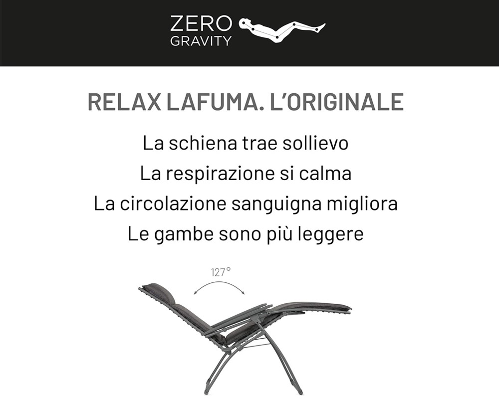 – numerose regolazioni: possibilità di scegliere tra molteplici posizioni, tra cui quella a «gravità zero», con le gambe leggermente poste al di sopra del livello del cuore per regalarvi un momento assoluto di relax.