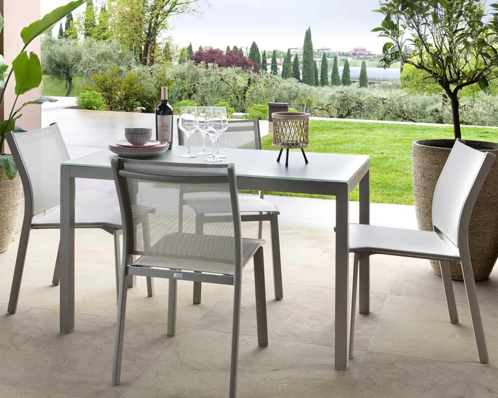 I materiali selezionati per il Set Pranzo Karol 120×70 + 4 Sedie Karol sono di alta qualità e progettati per resistere alle intemperie, assicurando durabilità nel tempo. L’alluminio, protagonista sia del tavolo che delle sedie, è leggero ma resistente alla corrosione, ideale per gli utilizzi all’esterno. Il vetro temperato del piano del tavolo garantisce una superficie liscia e sicura, mentre il textilene delle sedie offre un comfort ottimale e una facile manutenzione. Inoltre, il colore beige delle sedie si abbina splendidamente a qualsiasi arredamento esterno, creando un ambiente accogliente e raffinato per i tuoi momenti conviviali all’aperto