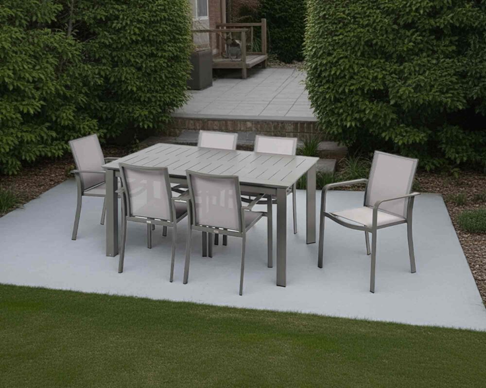 Le 6 poltrone New Croisette completano l’aspetto moderno ed elegante del set. Realizzate in alluminio e Textilene Taupe, queste poltrone offrono un comfort eccellente e un supporto ergonomico per lunghe sedute all’aperto. Il tessuto Textilene Taupe è resistente all’usura e facile da pulire, garantendo una durata nel tempo senza compromessi sullo stile.