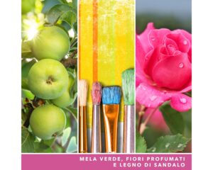 Il profumo fresco e verdeggiante di erbe aromatiche, foglie di tè e petali di rosa si fondono armoniosamente creando un’atmosfera rilassante e rigenerante. L’aroma leggero e delicato è perfetto per creare un’atmosfera pacifica e serena nella tua casa. Come una passeggiata in un parco primaverile, la candela Art In The Park è una rinfrescante boccata d’aria fresca che nutre il tuo spirito e rinnova il tuo benessere.