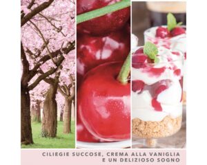 Una ciotola di ciliegie! Profumi ispirati ai amponi e alle mandorle, ricoperti da soffici nuvole rosa pastello che evocano la panna alla vaniglia.