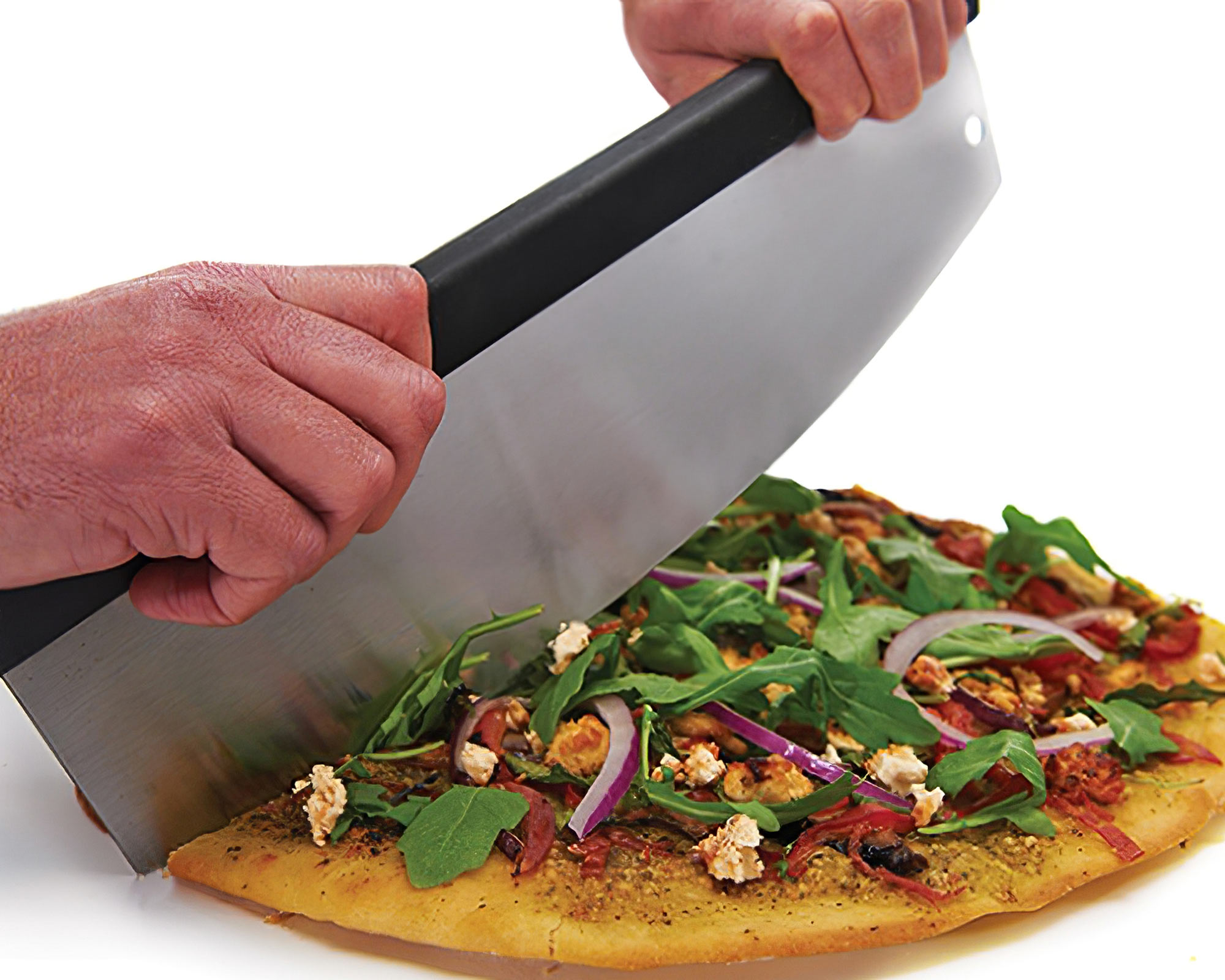 Il coltello largo con lama arrotondata grazie alla semplice oscillazione vi permetterà di tagliare e sminuzzare ingredienti e impasti risparmiando energie. Questo taglia pizza è inoltre un perfetto coltello trita erbe.