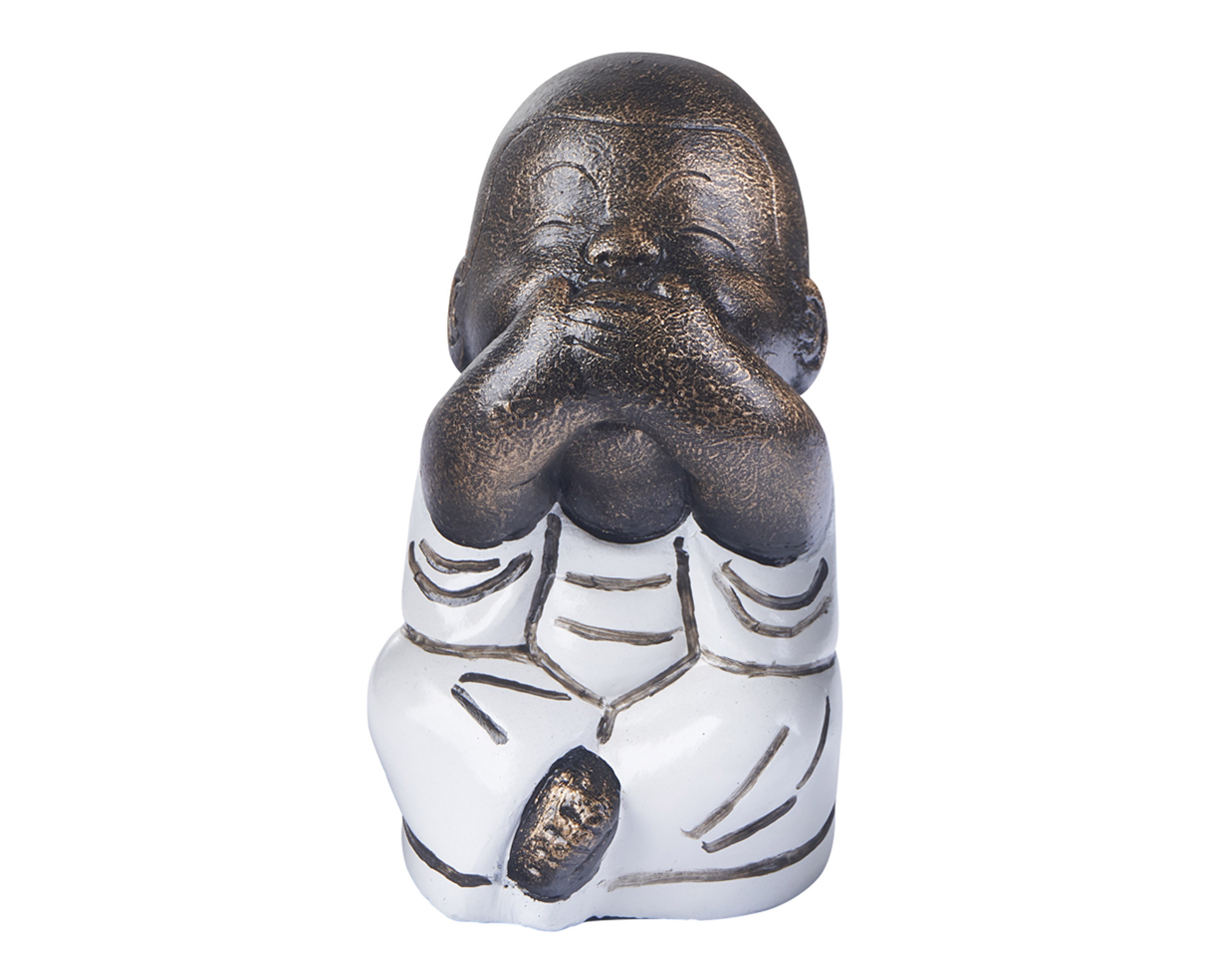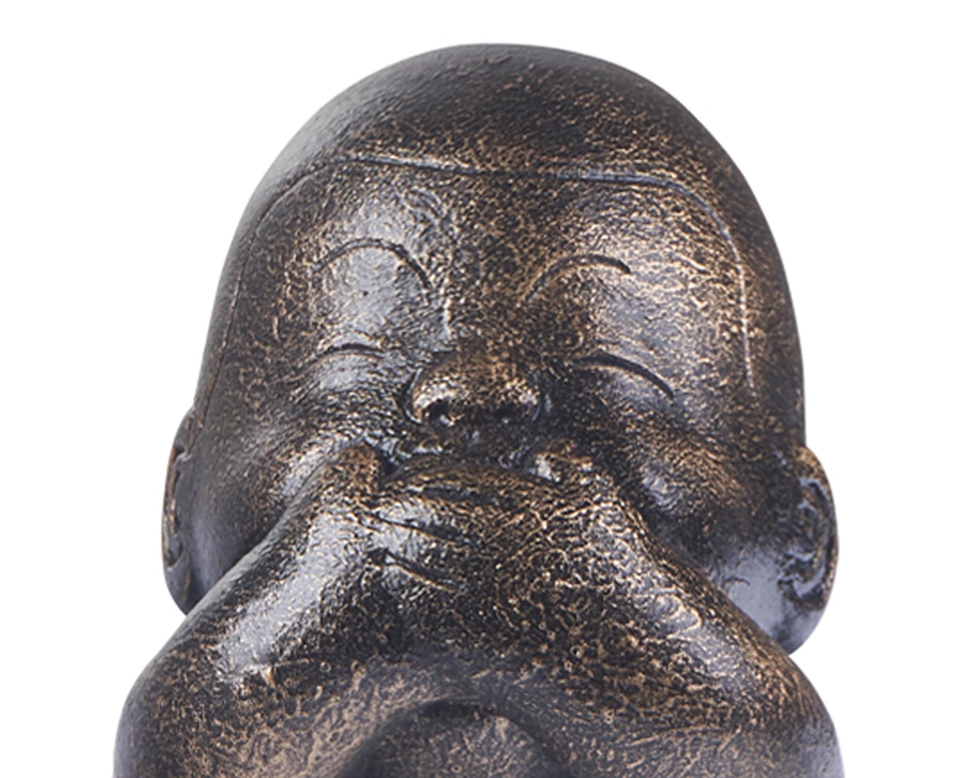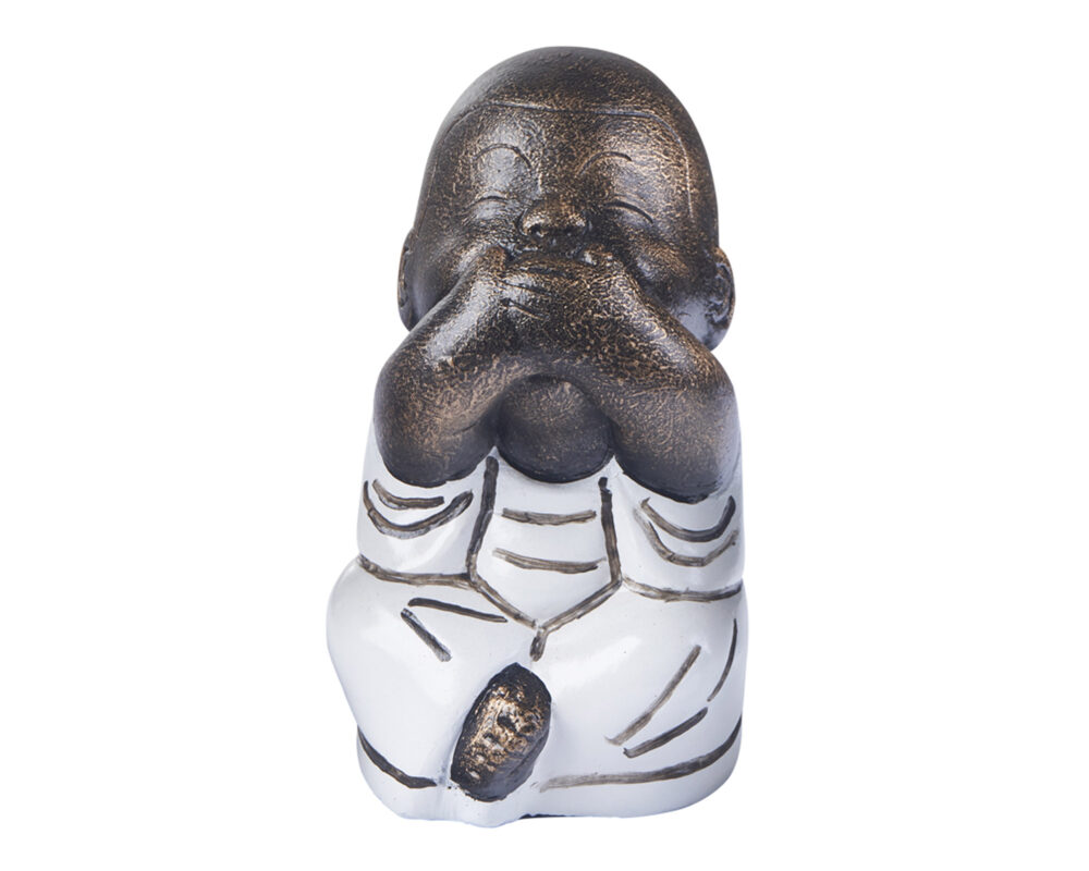 Statuetta, in resina, di un giovane monaco buddista seduto che non parla. Può essere collocata su un qualsiasi mobile, armadio, scaffale, libreria o tavolo, creando un gradevole effetto decorativo.
