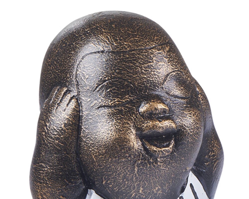 Statuetta, in resina, di un giovane monaco buddista seduto che non parla. Può essere collocata su un qualsiasi mobile, armadio, scaffale, libreria o tavolo, creando un gradevole effetto decorativo.