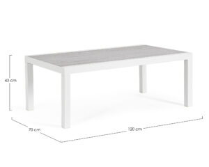 La superficie del tavolino è realizzata in alluminio di alta qualità, con una finitura bianca elegante e sofisticata che si adatta perfettamente a qualsiasi tipo di arredamento. La struttura del tavolino è realizzata in metallo resistente, che assicura la massima stabilità e durata nel tempo.