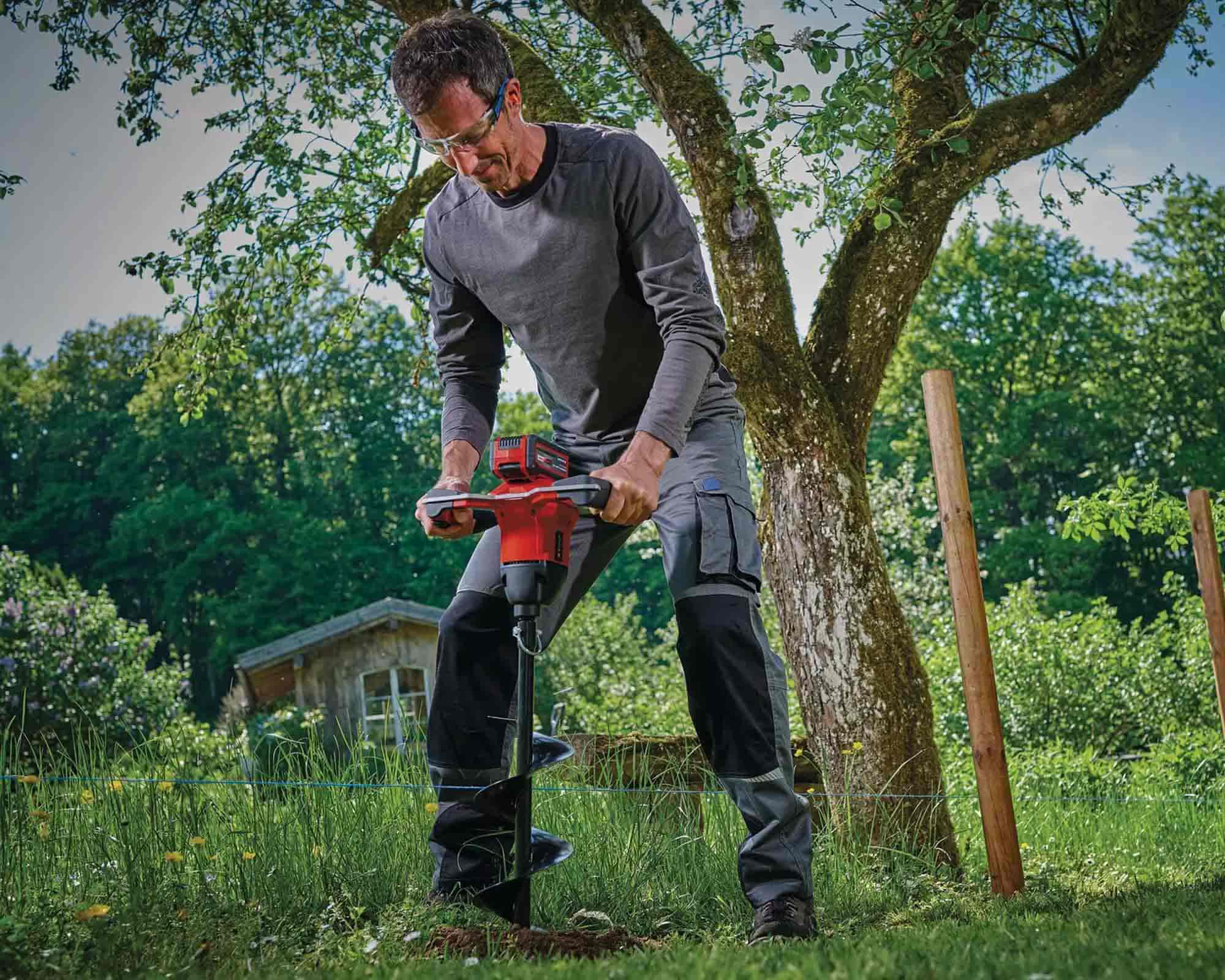 La trivella a batteria GP-EA 18/150 Li BL-Solo di Einhell è un valido aiuto per i proprietari di giardini e giardinieri per la piantumazione nel prato, lavori di installazione di accessori da giardinaggio come pali da recinzione, applicazione di decorazioni a terra o scavo di fondazioni circolari.
