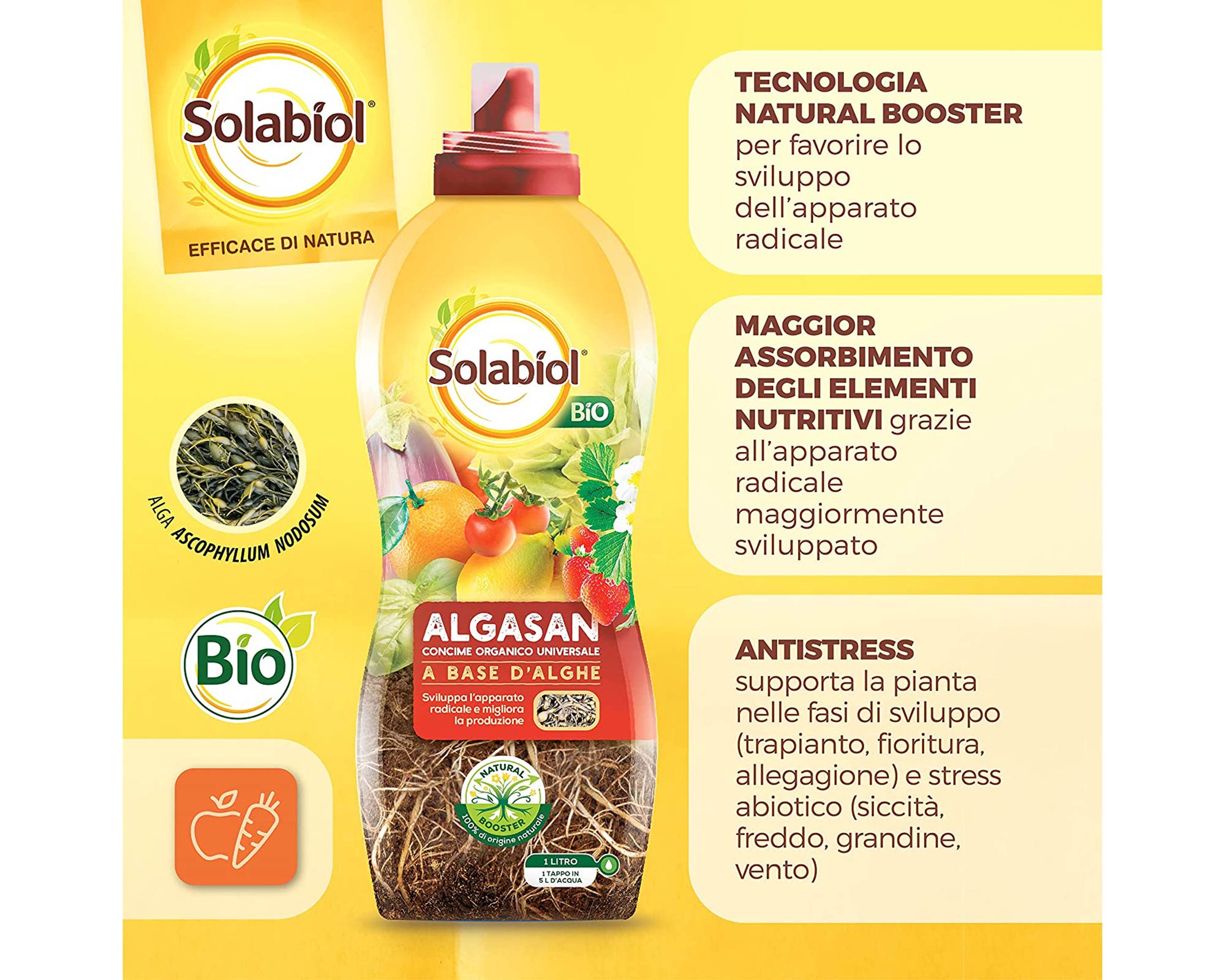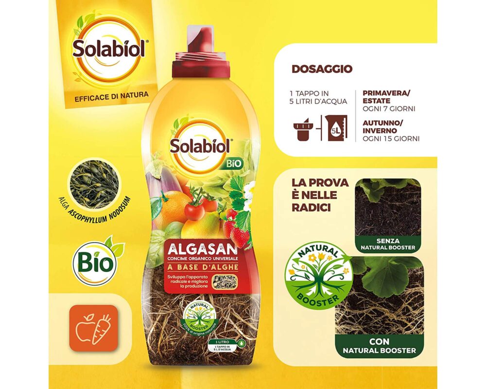 Solabiol Algasan è un concime a base dell’alga Ascophyllum nodosum 100% di origine naturale. Quest’alga promuove un maggior sviluppo dell’apparato radicale della pianta, aiutando a superare le fasi di stress (es a trapianto, siccità), favorendo così la crescita di piante sane e rigogliose.