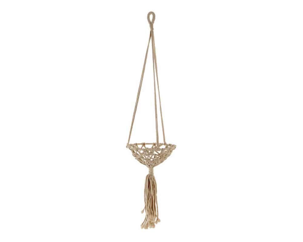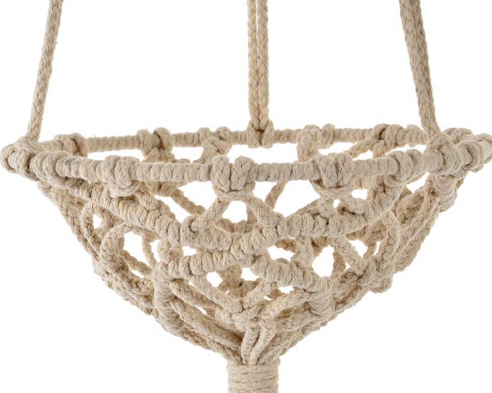 Il design sospeso con dettagli in corda intrecciata dona leggerezza visiva e un look artigianale, mentre la base in ferro garantisce stabilità e robustezza. Ideale sia in ambienti interni che in spazi coperti all’aperto, è un complemento versatile che si adatta a stili naturali, etnici o contemporanei.