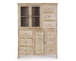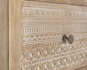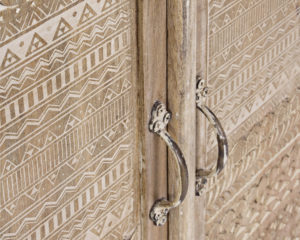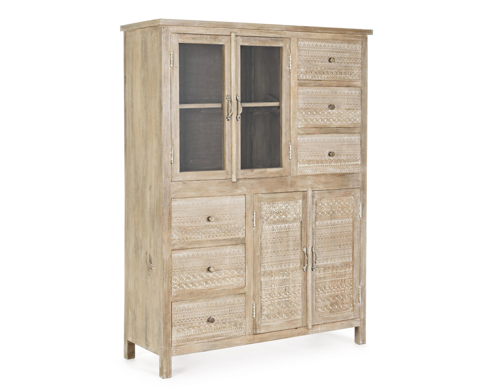 Questo mobile è perfetto per arredare il salotto, soggiorno o open space in stile Naturale e Etnico. E’ dotato di 2 ante in vetro con ripiano intermedio all’interno, 6 cassetti e 2 ante cieche con ripiano centrale. I frontali di ante e cassetti sono decorate con un particolare intarsio eseguito a mano.
