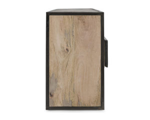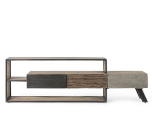 Materiale: Struttura in legno mango ed acciaio, schienale in compensato. frontale ante e cassetti in legno riciclato o lamina di acciaio o finitura in fibra di cemento. finitura acrilica protettiva.